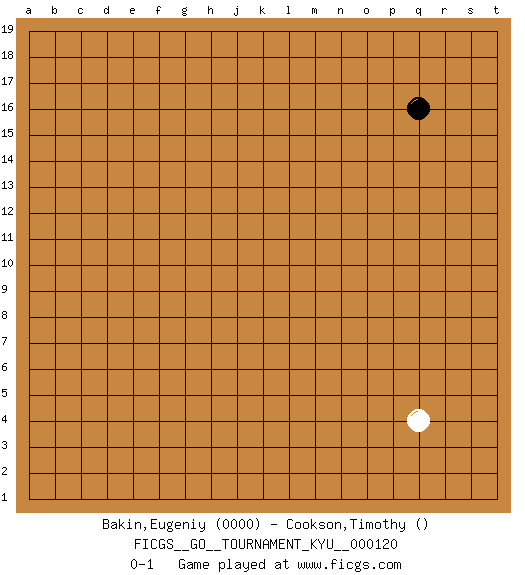 Last move : 0-1 2011 June 4 7:11:46 [Event "FICGS__GO__TOURNAMENT_KYU__000120"] [Site "FICGS"] [Date "2011.03.31"] [Round "1"] [Black "Bakin,Eugeniy"] [White "Cookson,Timothy"] [Result "0-1"] [Rating 1 "0000"] 1.q16 q4 0-1 This go game has been lost on time (started : 2011.03.31 18:5:38) Here are the names of the openings (joseki) played in the four corners : Corner q4 : q4 0-1 Hoshi (Hwajeom, Seongjeom, Xingwei`) 4-4 Point. The star or hoshi (4-4) point, emphasizing influence at the potential expense of territory. Player White won this Go (weiqi, baduk) game. Follow this game move after move (download)Avoid the plate connection. (Anonymous) The best weapon against an enemy is another enemy. (Friedrich Nietzsche)