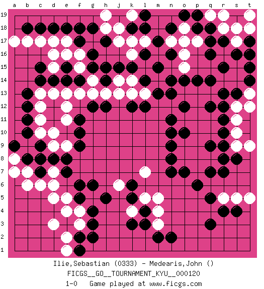Last move : 1-0 2011 July 18 21:54:21 [Event "FICGS__GO__TOURNAMENT_KYU__000120"] [Site "FICGS"] [Date "2011.03.31"] [Round "1"] [Black "Ilie,Sebastian"] [White "Medearis,John"] [Result "1-0"] [Rating 1 "0333"] 1.q16 d16 2.q3 d3 3.c14 r5 4.r7 d6 5.f17 c12 6.e15 q10 7.q12 r14 8.q14 d10 9.q5 p12 10.r13 p13 11.p14 p11 12.r11 s12 13.s13 s11 14.r10 s10 15.r9 q13 16.r12 q11 17.o14 s14 18.r15 s15 19.s16 t16 20.t14 s17 21.t15 t12 22.q9 s9 23.s8 t9 24.n11 p9 25.o10 o9 26.n9 p10 27.o7 o11 28.n10 o13 29.n13 o8 30.n7 p7 31.p6 q8 32.q7 p8 33.n8 k16 34.m17 j17 35.m15 m14 36.n14 l15 37.j15 j14 38.l16 k17 39.k15 k14 40.l14 l13 41.m13 o15 42.r8 s18 43.o12 r18 44.d8 c8 45.c7 d7 46.c9 b7 47.b8 c6 48.c8 d9 49.e8 b6 50.f10 e12 51.g12 e11 52.b11 c11 53.b12 c10 54.b10 a8 55.a9 a7 56.f6 e4 57.g4 g5 58.f5 f4 59.g3 f3 60.h5 d5 61.g6 e5 62.f2 e2 63.g2 e1 64.f1 g13 65.h12 h13 66.l12 k13 67.k12 f13 68.h14 j13 69.g15 d13 70.d14 c13 71.b13 e17 72.e18 d17 73.d18 d15 74.e14 g14 75.h15 e13 76.f11 e9 77.f9 p17 78.q17 o16 79.q18 q19 80.p19 r19 81.p18 o18 82.n18 g17 83.g18 f16 84.f18 f15 85.f14 e16 86.c15 h18 87.g16 c17 88.c18 b17 89.b18 a17 90.h17 h19 91.l18 l17 92.k18 j18 93.e7 n17 94.n16 o17 95.o19 t19 96.t17 t18 97.r17 t13 98.t16 k19 99.l19 t5 100.r4 s5 101.s4 m3 102.n2 m5 103.l4 k4 104.l3 m4 105.m2 l5 106.k3 j6 107.k5 l7 108.k6 1-0 Here are the names of the openings (joseki) played in the four corners : Corner d16 : d16 c14 Hoshi (Hwajeom, Seongjeom, Xingwei`) 4-4 Point. The star or hoshi (4-4) point, emphasizing influence at the potential expense of territory. Ikken Kakari (Hankan Keolch'im, Yi Gua`jiao~, 1-Space Low Approach). Black 2 is the standard approach move to the 4-4. Corner q4 : q3 r5 Komoku (Somok, Xiao~mu`) 3-4 Point. The komoku (3-4) point is the traditional corner enclosure move.. Ikken Kakari (Hankan Keolch'im, Yi Gua`jiao~, 1-Space Low Pincer). The small knight move is the basic approach move to the 3-4 point stone. It has been continually used for over four centuries. There are limitless variations, with new moves constantly being discovered. White 2 opens the door to a treaure store of joseki. Player Black won this Go (weiqi, baduk) game. Follow this game move after move (download)If you cannot succeed, then die gloriously. (Chinese proverb) If you lose the game you should win the analysis! (Proverb)