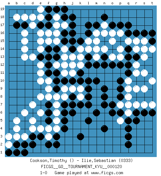Last move : 1-0 2011 November 18 17:52:57 [Event "FICGS__GO__TOURNAMENT_KYU__000120"] [Site "FICGS"] [Date "2011.03.31"] [Round "1"] [Black "Cookson,Timothy"] [White "Ilie,Sebastian"] [Result "1-0"] [Rating 2 "0333"] 1.q16 d17 2.q4 d4 3.d15 c13 4.d14 d13 5.e13 e12 6.f13 g16 7.f12 e11 8.f11 e10 9.g9 e8 10.k3 q10 11.j16 f15 12.d6 d7 13.f6 c6 14.c5 d5 15.c4 e6 16.r8 r14 17.q12 r12 18.q14 r15 19.r13 s13 20.q13 r11 21.c17 c18 22.e17 e18 23.d16 d18 24.f17 g17 25.n13 e14 26.f18 c16 27.b17 b18 28.h18 g18 29.g19 h17 30.j18 e16 31.j17 f16 32.f19 c15 33.p8 o10 34.n9 n10 35.m10 m9 36.l9 m8 37.l8 m7 38.l7 m11 39.l10 n12 40.l12 l11 41.k11 k12 42.m12 n11 43.m14 k13 44.m6 o8 45.p9 o9 46.p10 p11 47.q11 r9 48.p12 o11 49.o7 q15 50.p15 j11 51.k10 f10 52.g10 h11 53.j14 l14 54.o12 h13 55.g14 h14 56.h15 g15 57.g11 l15 58.l17 m16 59.m17 n16 60.o17 n17 61.n18 o16 62.p17 p16 63.r16 p14 64.s16 s15 65.t15 s14 66.s8 s9 67.h10 c3 68.t9 t10 69.t8 s11 70.g3 q8 71.q7 q9 72.n8 r7 73.r6 s7 74.s6 t7 75.t6 q6 76.q5 p7 77.p6 o15 78.f5 g8 79.e3 h8 80.d3 b4 81.c2 b3 82.f7 f8 83.j10 j13 84.h6 j7 85.j6 e4 86.n4 f4 87.g2 f3 88.f2 g4 89.h4 g5 90.h5 g6 91.h7 g7 92.l16 m15 93.h16 c14 94.f14 e15 95.b2 a2 96.j8 e19 97.h19 b1 98.d2 q7 99.r5 j9 100.k7 h9 101.h12 j12 102.k15 k14 103.j15 n14 104.q3 m13 105.l13 o13 106.n12 t14 107.t16 p13 108.q17 f9 109.c1 b5 110.a1 p5 111.o6 a3 112.q2 g12 113.g13 h12 114.n7 k9 115.b1 m14 116.l5 k8 117.j7 pass 118.pass 1-0 Here are the names of the openings (joseki) played in the four corners : Corner d16 : d17 d15 Komoku (Somok, Xiao~mu`) 3-4 Point. The komoku (3-4) point is the traditional corner enclosure move.. Ikken Takagakari (Hankan Nop'dakeolch'im, Yi Gaogua`jiao~, 1-Space High Approach). The 5-4 approach move has become more popular in modern times, as modern Go emphasizes speed and influence. Corner d4 : d4 g9 Hoshi (Hwajeom, Seongjeom, Xingwei`) 4-4 Point. The star or hoshi (4-4) point, emphasizing influence at the potential expense of territory. Corner q16 : q16 r14 Hoshi (Hwajeom, Seongjeom, Xingwei`) 4-4 Point. The star or hoshi (4-4) point, emphasizing influence at the potential expense of territory. Ikken Kakari (Hankan Keolch'im, Yi Gua`jiao~, 1-Space Low Approach). White 2 is the standard approach move to the 4-4. Player Black won this Go (weiqi, baduk) game. Follow this game move after move (download)Connect with good shape. (Anonymous) Hello Thibault, if I have had a plan (and I had one, I hope), I have forgotten it during the last week... - Hello Heinz-Georg. What do you mean a plan ? (Anonymous players, during a Big Chess game)