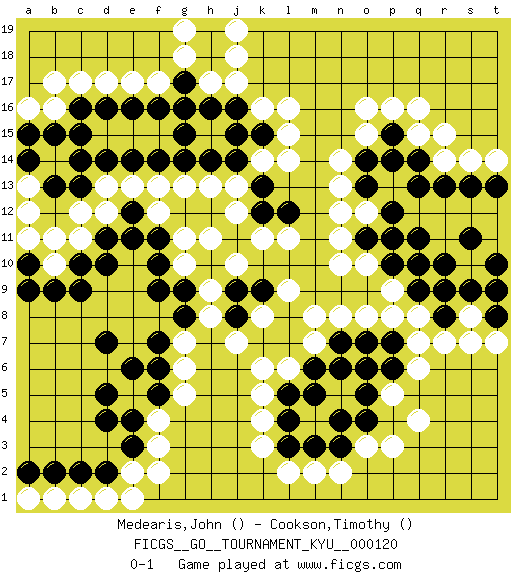 Last move : 0-1 2011 July 31 20:53:26 [Event "FICGS__GO__TOURNAMENT_KYU__000120"] [Site "FICGS"] [Date "2011.03.31"] [Round "1"] [Black "Medearis,John"] [White "Cookson,Timothy"] [Result "0-1"] 1.d16 q16 2.d4 q4 3.d10 f3 4.e3 f4 5.n4 k3 6.d7 j17 7.q10 o10 8.q13 o8 9.o6 q7 10.p7 p8 11.o7 n8 12.n6 m7 13.m6 l6 14.m5 f17 15.p15 m2 16.m3 n2 17.l4 p16 18.c14 r14 19.p14 o15 20.r13 r9 21.q9 q8 22.q11 n13 23.o13 o12 24.o14 n14 25.p12 s14 26.s13 s10 27.s11 k4 28.l5 k6 29.l3 l2 30.n3 o3 31.o4 p5 32.o5 d17 33.e16 e17 34.h16 h17 35.j16 k16 36.f16 g16 37.g15 k14 38.j14 j13 39.h14 h13 40.g14 g13 41.g17 g18 42.g16 c17 43.c16 b16 44.b15 a16 45.a15 k11 46.f5 e5 47.e4 g5 48.f6 g7 49.f9 g6 50.e6 p3 51.r10 o16 52.o11 n12 53.s9 s8 54.t10 f2 55.d5 e2 56.d2 d1 57.c2 f12 58.e12 e13 59.e14 d13 60.c13 d12 61.e11 h9 62.g8 h8 63.g9 g10 64.f11 g11 65.f10 c12 66.f14 f13 67.d11 c11 68.c10 b10 69.b9 b11 70.c9 b17 71.k15 l15 72.j15 l16 73.d14 k5 74.p10 n11 75.p11 n10 76.r8 r7 77.r9 s7 78.t8 t7 79.t9 e1 80.f7 c1 81.b2 b1 82.a2 a1 83.a10 a11 84.a9 q15 85.q14 t14 86.n7 m8 87.p6 q6 88.t13 r15 89.b13 a13 90.a14 a12 91.c15 p9 92.k13 l14 93.l12 l11 94.k12 j12 95.h18 j18 96.h19 j19 97.j11 g19 98.h10 j10 99.pass k8 100.j9 h11 101.j8 j7 102.k9 l9 103.pass pass 0-1 Here are the names of the openings (joseki) played in the four corners : Corner d4 : d4 f3 Hoshi (Hwajeom, Seongjeom, Xingwei`) 4-4 Point. The star or hoshi (4-4) point, emphasizing influence at the potential expense of territory. Ikken Kakari (Hankan Keolch'im, Yi Gua`jiao~, 1-Space Low Approach). White 2 is the standard approach move to the 4-4. Corner q4 : q4 n4 Hoshi (Hwajeom, Seongjeom, Xingwei`) 4-4 Point. The star or hoshi (4-4) point, emphasizing influence at the potential expense of territory. Niken Takagakari (Dukan Nop'dakeolch'im, E`r Gaojia, 2-Space High Approach). Black 2 is a light approach move. Rarely played in even games, Black 2 is typically employed in handicap games. White continues with 6-4 or 3-10. In Korean Sunjang Baduk White has a stone on 8-4. Corner d16 : d16 j17 Hoshi (Hwajeom, Seongjeom, Xingwei`) 4-4 Point. The star or hoshi (4-4) point, emphasizing influence at the potential expense of territory. Corner q16 : q16 q13 Hoshi (Hwajeom, Seongjeom, Xingwei`) 4-4 Point. The star or hoshi (4-4) point, emphasizing influence at the potential expense of territory. Niken Takagakari (Dukan Nop'dakeolch'im, E`r Gaojia, 2-Space High Approach). Black 2 is a light approach move. Rarely played in even games, Black 2 is typically employed in handicap games. White continues with 6-4 or 3-10. In Korean Sunjang Baduk White has a stone on 8-4. Player White won this Go (weiqi, baduk) game. Follow this game move after move (download)Territory really exists only in the end. (Pierre Audouard) Chess, like love, like music, has the power to make people happy. (Siegbert Tarrasch)