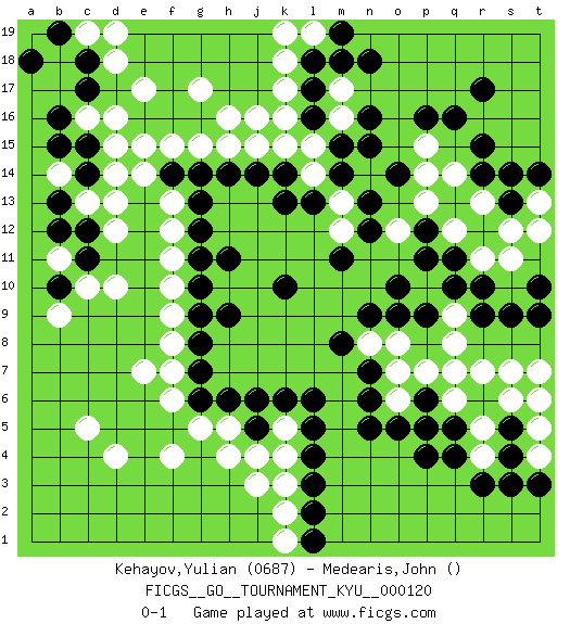 Last move : 0-1 2011 October 18 12:17:0 [Event "FICGS__GO__TOURNAMENT_KYU__000120"] [Site "FICGS"] [Date "2011.03.31"] [Round "1"] [Black "Kehayov,Yulian"] [White "Medearis,John"] [Result "0-1"] [Rating 1 "0687"] 1.r15 c5 2.q4 e17 3.q16 d4 4.r3 d16 5.q10 d10 6.o10 k4 7.l17 k16 8.k10 h16 9.l16 k15 10.m15 l15 11.m14 k17 12.l18 k18 13.l13 l19 14.m19 k19 15.n18 j16 16.l6 o6 17.n5 o8 18.n9 p7 19.n7 p5 20.p4 q6 21.o5 o7 22.q5 q7 23.p6 r7 24.r9 n8 25.m8 l14 26.n6 s7 27.s5 t7 28.s9 q8 29.p9 t5 30.s4 s6 31.t9 q9 32.o9 r5 33.p5 t4 34.t3 g17 35.l4 j3 36.j6 h4 37.h9 f9 38.h11 f11 39.g12 f12 40.g13 f13 41.k13 e7 42.g7 f4 43.j14 f15 44.l2 k2 45.l1 k5 46.k6 h5 47.g6 f6 48.h6 g5 49.g14 g15 50.l5 k3 51.l3 k1 52.g10 f10 53.g9 f7 54.g8 f8 55.f14 e14 56.g11 h15 57.h14 e15 58.k14 m16 59.n16 m13 60.n13 m12 61.n12 n14 62.n15 m17 63.m18 r4 64.s3 t6 65.j5 j4 66.m11 j15 67.c17 d18 68.c15 c16 69.b16 d15 70.c14 c13 71.b13 d13 72.b12 b11 73.c18 c19 74.b19 d19 75.a18 p13 76.o14 r13 77.s14 q14 78.r17 q12 79.r10 r11 80.s13 s12 81.q11 s11 82.p12 p14 83.r14 t13 84.t14 t12 85.t10 p15 86.p16 o12 87.p11 d14 88.c12 d12 89.c11 c10 90.b10 b14 91.b15 b9 0-1 This go game has been lost on time (started : 2011.03.31 18:5:38) Here are the names of the openings (joseki) played in the four corners : Player White won this Go (weiqi, baduk) game. Follow this game move after move (download)While the Baroque rules of chess could only have been created by humans, the rules of go are so elegant, organic, and rigorously logical that if intelligent life forms exist elsewhere in the universe, they almost certainly play go. (Edward Lasker, international chess master) Wisdom is the reward you get for a lifetime of listening when you'd have preferred to talk. (Doug Larson)