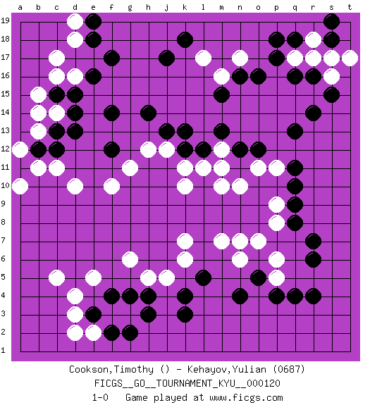 Last move : 1-0 2011 October 18 12:17:0 [Event "FICGS__GO__TOURNAMENT_KYU__000120"] [Site "FICGS"] [Date "2011.03.31"] [Round "1"] [Black "Cookson,Timothy"] [White "Kehayov,Yulian"] [Result "1-0"] [Rating 2 "0687"] 1.q16 c5 2.q4 d16 3.q10 d4 4.k3 c17 5.j17 d10 6.f17 f10 7.n4 g6 8.q13 r17 9.f14 k10 10.d14 c14 11.c13 b14 12.c15 b15 13.r16 q17 14.p17 s16 15.s15 t17 16.s18 s17 17.d15 c16 18.o16 r18 19.p18 j5 20.h3 g3 21.h14 h12 22.j13 j12 23.k12 k11 24.l12 m10 25.r7 n10 26.g2 f3 27.e16 d18 28.l5 k7 29.h4 h5 30.f2 e2 31.e3 d2 32.f4 d3 33.g4 e5 34.d13 b13 35.b12 c11 36.r14 m7 37.r4 n7 38.c12 b11 39.a11 a10 40.e18 a12 41.o5 o7 42.n12 o11 43.o12 p11 44.q11 p9 45.q9 p8 46.q8 p6 47.k4 k6 48.q18 l11 49.f12 g11 50.k13 m12 51.m13 m11 52.r6 p5 53.p4 n6 54.e19 d19 55.s19 l17 56.k18 n17 57.n16 m16 58.m15 1-0 This go game has been lost on time (started : 2011.03.31 18:5:38) Here are the names of the openings (joseki) played in the four corners : Player Black won this Go (weiqi, baduk) game. Follow this game move after move (download)When you study joseki, you lose two stones in strength. (Anonymous) Perception is reality. (Immanuel Kant)