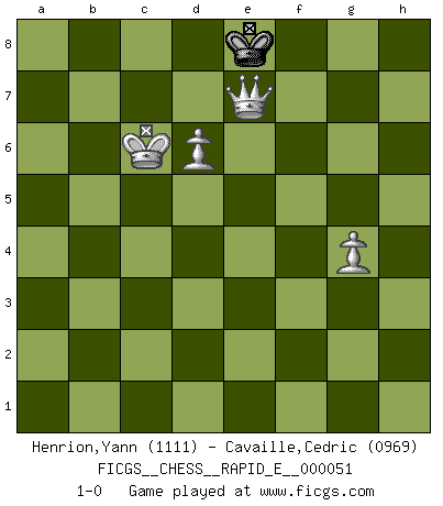 Last move : 1-0 2011 May 20 21:18:14 [Event "FICGS__CHESS__RAPID_E__000051"] [Site "FICGS"] [Date "2011.03.31"] [Round "1"] [White "Henrion,Yann"] [Black "Cavaille,Cedric"] [Result "1-0"] [WhiteElo "1111"] [BlackElo "0969"] 1.f4 c5 2.Nf3 d6 3.e3 Nf6 4.b3 Nc6 5.Bb2 Bg4 6.Be2 Bxf3 7.Bxf3 e6 8.O-O Be7 9.Qe2 O-O 10.Bxc6 bxc6 11.c4 d5 12.d3 d4 13.e4 a5 14.Nd2 a4 15.e5 Nd7 16.Qf3 Qb6 17.Rfb1 axb3 18.Nxb3 f6 19.exf6 Bxf6 20.Bc1 Qc7 21.Bd2 e5 22.Qe4 exf4 23.Bxf4 Be5 24.Bxe5 Qxe5 25.Qxc6 Rad8 26.Re1 Qf6 27.Qxf6 Nxf6 28.Nxc5 Rde8 29.Rxe8 Rxe8 30.h3 Rc8 31.Nb3 Nd7 32.Nxd4 Nc5 33.Rd1 Rd8 34.Nf3 h5 35.d4 Na4 36.d5 Kf7 37.Kf2 Kf6 38.g4 hxg4 39.hxg4 g5 40.Rc1 Rc8 41.Ke3 Nc5 42.Kd4 Nd7 43.c5 Ra8 44.c6 Nb6 45.Kc5 Ra3 46.Kxb6 Rxf3 47.c7 Rf2 48.c8Q Rxa2 49.Qf5+ Ke7 50.Qxg5+ Kd6 51.Rc6+ Kd7 52.Qg7+ Kd8 53.d6 Rb2+ 54.Kc5 Rc2+ 55.Kd5 Rxc6 56.Kxc6 Ke8 57.Qe7+ 1-0 Bird's Opening Kingside Castling by player White (move 8) Kingside Castling by player Black (move 9) 10 pieces endgame at move 46 : White KRNPPPP , Black KRP WHITE : King + 1 Rook 1 Knight 4 Pawns BLACK : King + 1 Rook 1 Pawn 9 pieces endgame at move 46 : White KRPPPP , Black KRP WHITE : King + 1 Rook 4 Pawns BLACK : King + 1 Rook 1 Pawn Promotion Queen by player White (move 48) 8 pieces endgame at move 48 : White KQRPP , Black KRP WHITE : King + 1 Queen 1 Rook 2 Pawns BLACK : King + 1 Rook 1 Pawn 7 pieces endgame at move 50 : White KQRPP , Black KR WHITE : King + 1 Queen 1 Rook 2 Pawns BLACK : King + 1 Rook 6 pieces endgame at move 55 : White KQPP , Black KR WHITE : King + 1 Queen 2 Pawns BLACK : King + 1 Rook 5 pieces endgame at move 56 : White KQPP , Black K WHITE : King + 1 Queen 2 Pawns BLACK : King + Player White won this chess game. Follow this game move after move (download)Good offense and good defense both begin with good development. (Bruce A. Moon) Ich könnte leicht behaupten: Ja,ja, Leonid Breschnew wollte nicht, daß ich Weltmeister werde. In der Tat war die Sache komplizierter. (Viktor Kortschnoi) Diferente gente reacciona diferentemente en aceptar la derrota. (Bobby Fischer) La vie et les Echecs sont tous les deux une lutte constante. (Lasker) May the force be with you. (Han Solo in Star Wars ep.4)