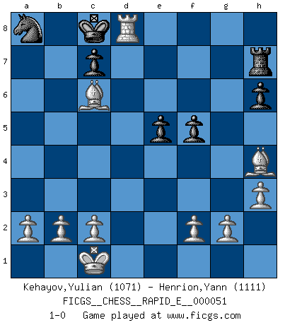 Last move : 1-0 2011 May 8 17:13:2 [Event "FICGS__CHESS__RAPID_E__000051"] [Site "FICGS"] [Date "2011.03.31"] [Round "1"] [White "Kehayov,Yulian"] [Black "Henrion,Yann"] [Result "1-0"] [WhiteElo "1071"] [BlackElo "1111"] 1.e4 e5 2.Nc3 d6 3.Nf3 Bg4 4.h3 Be6 5.d4 f5 6.Ng5 Qe7 7.Nxe6 Qxe6 8.Qh5+ g6 9.exf5 Qxf5 10.Qxf5 gxf5 11.Nd5 Kd7 12.dxe5 dxe5 13.Bg5 h6 14.Bh4 Be7 15.Nxe7 Nxe7 16.O-O-O Ke6 17.Bc4+ Nd5 18.Bxd5+ Kd7 19.Bxb7 Ke6 20.Bd5+ Kd7 21.Bxa8 Kc8 22.Rd5 Nd7 23.Rhd1 Rh7 24.Bc6 a5 25.Rxa5 Nb6 26.Ra8+ Nxa8 27.Rd8+ 1-0 Vienna game Queenside Castling by player White (move 16) Player White won this chess game. Follow this game move after move (download)Modern Chess is too much concerned with things like Pawn structure. Forget it, Checkmate ends the game. (Nigel Short) Ich suche im Schach immer etwas Eigenes. Riskantes Spiel im Stile schachlicher Musketiere ist nicht meine Sache, auch wenn es vielen Freunden scharfer Wendungen gefällt. (Anatoly Karpov) Una mala movida nulifica cuarenta buenas. (Horowitz) Les Echecs représentent une sphère d'idées créatrices basée sur la volonté des deux protagonistes. (Smyslov) Never risk one's whole fortune unless supported by one's entire army. (Niccolo Machiavelli)