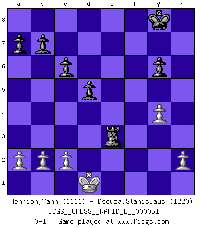 Last move : 0-1 2011 May 28 8:9:21 [Event "FICGS__CHESS__RAPID_E__000051"] [Site "FICGS"] [Date "2011.03.31"] [Round "1"] [White "Henrion,Yann"] [Black "Dsouza,Stanislaus"] [Result "0-1"] [WhiteElo "1111"] [BlackElo "1220"] 1.e4 f5 2.exf5 Nf6 3.d3 e6 4.fxe6 dxe6 5.Bg5 g6 6.Nc3 Bb4 7.Qf3 O-O 8.O-O-O Be7 9.Qe2 h6 10.Bxh6 Rf7 11.Nf3 Nc6 12.Bg5 Nh7 13.Bxe7 Nxe7 14.Ne5 Rg7 15.d4 Nd5 16.Nxd5 exd5 17.Qb5 c6 18.Qc5 Bf5 19.Bd3 Bxd3 20.Rxd3 Ng5 21.Qc3 Qf6 22.Qd2 Ne4 23.Qe2 Nd6 24.g4 Nb5 25.f4 Qxf4+ 26.Kd1 Nxd4 27.Qe1 Re8 28.Re3 Rge7 29.Rf1 Qg5 30.Nf3 Nxf3 31.R1xf3 Rxe3 32.Rxe3 Qxe3 33.Qxe3 Rxe3 0-1 Fred Kingside Castling by player Black (move 7) Queenside Castling by player White (move 8) Player Black won this chess game. Follow this game move after move (download)Bobby Fischer is the greatest Chess player who has ever lived. (Ken Smith) Der Partner hat auch seine Existenzberechtigung. (Savielly Grigorievitsch Tartakower) El Ajedrez expande y enriquece tu mente. (Saudin Robovic) Les Echecs ont trois composantes : le temps, l'espace et le matériel en dernier. (Mikhail Tal) I've never seen so many men wasted so badly. (Blondie in The Good, The Bad and The Ugly)