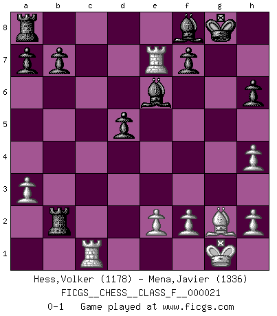 Last move : 0-1 2007 March 17 14:14:35 [Event "FICGS__CHESS__CLASS_F__000021"] [Site "FICGS"] [Date "2006.12.14"] [Round "1"] [White "Hess,Volker"] [Black "Mena,Javier"] [Result "0-1"] [WhiteElo "1178"] [BlackElo "1336"] 1.c4 Nf6 2.Nc3 g6 3.g3 Bg7 4.Bg2 O-O 5.Nf3 d6 6.O-O e5 7.d3 Nbd7 8.Bg5 h6 9.Bxf6 Nxf6 10.Rb1 Re8 11.b4 e4 12.Nxe4 Nxe4 13.dxe4 Rxe4 14.c5 Bf5 15.Rc1 Rxb4 16.cxd6 Qxd6 17.Nh4 Be6 18.Qxd6 cxd6 19.a3 Rb2 20.Rc7 g5 21.Rfc1 gxh4 22.gxh4 d5 23.Re7 Bf8 0-1 English Opening Kingside Castling by player Black (move 4) Kingside Castling by player White (move 6) Player Black won this chess game. Follow this game move after move (download)The chessboard is the world, the pieces are the phenomena of the Universe, the rules of the game are what we call the laws of Nature and the player on the other side is hidden from us. (Thomas Huxley) Sehr viele beherrschen heutzutage das große Einmalseins des Schachspiels und kennen sogar dessen Logarithmentafeln auswendig - deshalb sollte man hin und wieder zu beweisen trachten, dass zwei mal zwei auch fünf sein kann. (Mikhail Nekhemyevich Tal) El Ajedrez es un regaderazo frío para la mente. (Sir John Simon) Il vaut mieux sacrifier les pièces de l'adversaire. (Xavier Tartacover) Children in the dark cause accidents, accidents in the dark cause children. (Unknown)