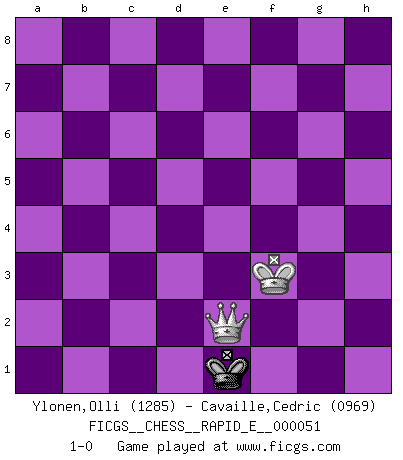 Last move : 1-0 2011 May 6 22:6:8 [Event "FICGS__CHESS__RAPID_E__000051"] [Site "FICGS"] [Date "2011.03.31"] [Round "1"] [White "Ylonen,Olli"] [Black "Cavaille,Cedric"] [Result "1-0"] [WhiteElo "1285"] [BlackElo "0969"] 1.e4 c5 2.Nf3 d6 3.d4 cxd4 4.Nxd4 Nf6 5.Nc3 Nc6 6.Bg5 Nxd4 7.Qxd4 e5 8.Qd2 a6 9.Bxf6 Qxf6 10.Nd5 Qd8 11.Bc4 b5 12.Bb3 g6 13.Qc3 Be6 14.Qc6+ Bd7 15.Qxa8 Qxa8 16.Nc7+ Ke7 17.Nxa8 Bg7 18.Nb6 Be6 19.Bxe6 fxe6 20.O-O Rb8 21.Nd5+ exd5 22.exd5 Rc8 23.c3 Rc5 24.a4 Rxd5 25.axb5 axb5 26.Rfd1 Rxd1+ 27.Rxd1 Ke6 28.Ra1 Kd5 29.Ra7 Bf6 30.Rxh7 Kc4 31.Rh6 Kb3 32.Rxg6 Be7 33.Rg7 Bf6 34.Rd7 Kxb2 35.Rxd6 Bg7 36.Rc6 e4 37.h4 Bxc3 38.Rxc3 Kxc3 39.h5 b4 40.h6 b3 41.h7 b2 42.h8Q+ Kc2 43.Qxb2+ Kxb2 44.g4 Kc3 45.g5 Kd3 46.g6 e3 47.fxe3 Kxe3 48.g7 Ke2 49.g8Q Ke1 50.Qa2 Kd1 51.Kf1 Kc1 52.Kf2 Kd1 53.Kf3 Ke1 54.Qe2+ 1-0 Sicilian : Richter-Rauzer Kingside Castling by player White (move 20) 10 pieces endgame at move 35 : White KRPPPP , Black KBPP WHITE : King + 1 Rook 4 Pawns BLACK : King + 1 Bishop 2 Pawns 9 pieces endgame at move 37 : White KRPPP , Black KBPP WHITE : King + 1 Rook 3 Pawns BLACK : King + 1 Bishop 2 Pawns 8 pieces endgame at move 38 : White KRPPP , Black KPP WHITE : King + 1 Rook 3 Pawns BLACK : King + 2 Pawns 7 pieces endgame at move 38 : White KPPP , Black KPP WHITE : King + 3 Pawns BLACK : King + 2 Pawns Promotion Queen by player White (move 42) 6 pieces endgame at move 43 : White KQPP , Black KP WHITE : King + 1 Queen 2 Pawns BLACK : King + 1 Pawn 5 pieces endgame at move 43 : White KPP , Black KP WHITE : King + 2 Pawns BLACK : King + 1 Pawn 4 pieces endgame at move 47 : White KPP , Black K WHITE : King + 2 Pawns BLACK : King + 3 pieces endgame at move 47 : White KP , Black K WHITE : King + 1 Pawn BLACK : King + Promotion Queen by player White (move 49) Player White won this chess game. Follow this game move after move (download)Though most people love to look at the games of the great attacking masters, some of the most successful players in history have been the quiet positional players. They slowly grind you down by taking away your space, tying up your pieces, and leaving you with virtually nothing to do ! (Yasser Seirawan) Frage des Reporters: -Welche besonderen Umstände rechtfertigen das Anhalten der Uhren während einer Turnierpartie? Antwort: -Einen Fotographen zu strangulieren. (Siegbert Tarrasch) La captura del Rey enemigo es la finalidad pero no el primer objetivo de la partida. (William Steinitz) Le succès, c'est être capable d'aller d'échec en échec sans perdre son enthousiasme. (Winston Churchill) All art requires courage. (Anne Tucker)
