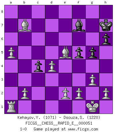 Last move : 1-0 2011 May 26 14:54:34 [Event "FICGS__CHESS__RAPID_E__000051"] [Site "FICGS"] [Date "2011.03.31"] [Round "1"] [White "Kehayov,Yulian"] [Black "Dsouza,Stanislaus"] [Result "1-0"] [WhiteElo "1071"] [BlackElo "1220"] 1.d4 f5 2.Nf3 Nf6 3.Nc3 e6 4.g3 Bb4 5.Bg2 Nd5 6.O-O O-O 7.Nxd5 a5 8.Bg5 Qe8 9.Nxc7 Qf7 10.Nxa8 Nc6 11.Nb6 h6 12.Bf4 d5 13.a3 Be7 14.Qd2 e5 15.Nxe5 Nxe5 16.Bxe5 Be6 17.Qxa5 Bd8 18.Qb5 Bxb6 19.Qxb6 Rc8 20.Rfc1 Rc6 21.Qb5 g5 22.c4 Rxc4 23.Rxc4 dxc4 24.Qxb7 Qxb7 25.Bxb7 Bf7 26.a4 Kh7 27.a5 1-0 Dutch Kingside Castling by player White (move 6) Kingside Castling by player Black (move 6) Player White won this chess game. Follow this game move after move (download)Chess is so inspiring that I do not believe a good player is capable of having an evil thought during the game. (Wilhelm Steinitz) Kombinieren und Schwarzhandel gehören verboten. (Savielly Grigorievitsch Tartakower) Yo no creo en la psicología. Yo creo en las buenas movidas. (Bobby Fischer) La victoire dans une partie d'Echecs appartient la plupart du temps à celui qui voit un peu plus loin que l'adversaire. (Lasker) Crush them ! Make them suffer ! (General Grievous in Star Wars ep.3)