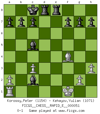 Last move : 0-1 2011 April 25 22:30:18 [Event "FICGS__CHESS__RAPID_E__000051"] [Site "FICGS"] [Date "2011.03.31"] [Round "1"] [White "Korossy,Peter"] [Black "Kehayov,Yulian"] [Result "0-1"] [WhiteElo "1154"] [BlackElo "1071"] 1.e4 e5 2.Nf3 Nc6 3.d4 exd4 4.Nxd4 Bc5 5.c3 Nf6 6.f3 d5 7.Be2 dxe4 8.O-O Nxd4 9.cxd4 Qxd4+ 10.Kh1 Qxd1 11.Rxd1 Bd7 12.Nc3 O-O-O 13.fxe4 Ng4 14.h3 Nf2+ 15.Kg1 Nxd1 16.Kf1 Nxc3 17.bxc3 Rhe8 18.Bd3 Bc6 19.Bc2 Bxe4 20.Bf4 Bxc2 0-1 Scotch game Kingside Castling by player White (move 8) Queenside Castling by player Black (move 12) Player Black won this chess game. Follow this game move after move (download)The game of chess is the touchstone of the intellect. (Goethe) Das Schach ist nichts für kleine Geister, es beansprucht einen vollen Mann, der sich nicht sklavisch an das Überlieferte hält, sondern selbständig die Tiefen des Spiels zu ergründen sucht. (Wilhelm Steinitz) Cualquier cambio de material en una posición debe venir por medio de un mate, una captura o promoción de Peón. (Purdy) J'apprécie les joueurs d'est-indienne, c'est grâce à eux que je nourris ma famille depuis tant d'années. (Petrosian) Players are not good because they find tactics, it is about the way to find the positions in which those tactics are hidden. (Luc-Olivier Leclerc)