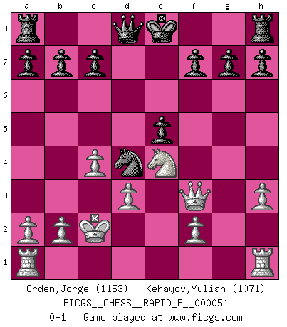 Last move : 0-1 2011 May 18 17:58:29 [Event "FICGS__CHESS__RAPID_E__000051"] [Site "FICGS"] [Date "2011.03.31"] [Round "1"] [White "Orden,Jorge"] [Black "Kehayov,Yulian"] [Result "0-1"] [WhiteElo "1153"] [BlackElo "1071"] 1.e4 e5 2.Nf3 Nc6 3.Be2 Nf6 4.d3 d5 5.exd5 Nxd5 6.c4 Bb4+ 7.Bd2 Bxd2+ 8.Nbxd2 Nf4 9.Ne4 Nxg2+ 10.Kd2 Nf4 11.Kc2 Nxe2 12.Qxe2 Bg4 13.h3 Bxf3 14.Qxf3 Nd4+ 0-1 Inverted Hungarian Player Black won this chess game. Follow this game move after move (download)The older I grow, the more I value Pawns. (Keres) Es hat in meinem Leben Zeiten gegeben, da ich sehr nahe daran war zu glauben, daß ich auch nicht eine einzige Schachpartie verlieren könnte. (José Raúl Capablanca) En manos de Fischer's, una diminuta ventaja teórica es tan buena como tener una Reina de ventaja. (Isaac Kashdan) Vous n'êtes pas toujours obligé de jouer le meilleur coup. Un coup doit être actif, entreprenant, correct et beau ! (David Bronstein) When you've done things right people won't know you've done anything at all. (Futurama)