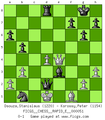Last move : 0-1 2011 May 17 16:46:1 [Event "FICGS__CHESS__RAPID_E__000051"] [Site "FICGS"] [Date "2011.03.31"] [Round "1"] [White "Dsouza,Stanislaus"] [Black "Korossy,Peter"] [Result "0-1"] [WhiteElo "1220"] [BlackElo "1154"] 1.f4 d5 2.Nf3 e6 3.e3 Nf6 4.Be2 Bd6 5.O-O O-O 6.d3 c5 7.Nc3 a6 8.b3 b5 9.Bb2 Nc6 10.h3 g6 11.Nh4 e5 12.fxe5 Nxe5 13.Nf3 Qe8 14.Nxe5 Qxe5 15.Rb1 Bb7 16.Rf3 d4 17.exd4 cxd4 18.Ne4 Bxe4 19.dxe4 Nxe4 20.Bxd4 Qh2+ 21.Kf1 Qh1+ 22.Bg1 Bh2 23.Qd4 Rfd8 24.Qb6 Nd2+ 25.Ke1 Nxb1 26.Rd3 Rxd3 27.cxd3 Bxg1 28.Qc6 Be3 29.Bf1 Rd8 30.Qe4 Qg1 31.d4 Qf2+ 32.Kd1 Qd2+ 0-1 Bird's Opening Kingside Castling by player White (move 5) Kingside Castling by player Black (move 5) Player Black won this chess game. Follow this game move after move (download)Chess is no whit inferior to the violin, and we have a large number of professional violinists. (Mikhail Botvinnik) Wenn Du einsam bist, wenn Du Dich in der Welt wie ein Fremder fühlst, spiele Schach. Das wird Deinen Geist erheben und Dein Ratgeber im Kampf sein. (Aristoteles) El Ajedrez es tan interesante por sí solo, que no es necesario un interés monetario para persuadir a una persona a que lo practique; por lo tanto, nunca se juega por dinero. (Benjamin Franklin) On peut tirer plus d'utilité d'une partie perdue que de 100 parties gagnées. (Capablanca) If only faces could talk... (Pat Summerall, Sportscaster during the Super Bowl)