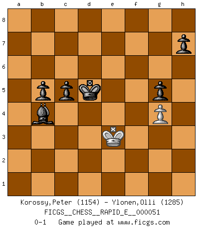 Last move : 0-1 2011 June 21 22:23:38 [Event "FICGS__CHESS__RAPID_E__000051"] [Site "FICGS"] [Date "2011.03.31"] [Round "1"] [White "Korossy,Peter"] [Black "Ylonen,Olli"] [Result "0-1"] [WhiteElo "1154"] [BlackElo "1285"] 1.e4 e5 2.Nf3 Nc6 3.d4 exd4 4.Nxd4 Nf6 5.Bd3 Nxd4 6.O-O d6 7.Be3 Nc6 8.Nc3 Be7 9.a3 Be6 10.b4 O-O 11.g3 Ng4 12.Be2 Nxe3 13.fxe3 Bf6 14.Qd2 a6 15.Na2 Bxa2 16.Rxa2 Qe7 17.Qd3 Rfe8 18.Bf3 Ne5 19.Qd1 Nxf3+ 20.Qxf3 Qxe4 21.Qxe4 Rxe4 22.Re1 Rae8 23.Kf2 Bg5 24.c3 Rxe3 25.Rc1 Re2+ 26.Rxe2 Rxe2+ 27.Kxe2 Bxc1 28.a4 f5 29.Kf3 Bd2 30.c4 Bxb4 31.h3 Kf7 32.Kf4 Ke6 33.g4 fxg4 34.hxg4 c5 35.Ke4 g5 36.Kf3 d5 37.cxd5+ Kxd5 38.Ke3 b5 39.axb5 axb5 0-1 Scotch : Schmidt variation Kingside Castling by player White (move 6) Kingside Castling by player Black (move 10) 10 pieces endgame at move 37 : White KPP , Black KBPPPPP WHITE : King + 2 Pawns BLACK : King + 1 Bishop 5 Pawns 9 pieces endgame at move 39 : White KPP , Black KBPPPP WHITE : King + 2 Pawns BLACK : King + 1 Bishop 4 Pawns 8 pieces endgame at move 39 : White KP , Black KBPPPP WHITE : King + 1 Pawn BLACK : King + 1 Bishop 4 Pawns Player Black won this chess game. Follow this game move after move (download)Some part of a mistake is always correct. (Savielly Tartakover) Jede Eröffnung ist gut genug um gespielt zu werden, wenn nur ihr Ruf schlecht genug ist. (Savielly Grigorievitsch Tartakower) Peones: ellos son el alma de esta partida, solos forman el ataque y la defensa. (Philidor) Il a essayé de se convaincre qu'il pourrait empêcher toutes les erreurs et ne jamais perdre. L'horreur ! Gary Kasparov au sujet de Robert Fischer. He who fights with monsters should be careful lest he thereby become a monster. (Friedrich Nietzsche, Beyond Good and Evil)