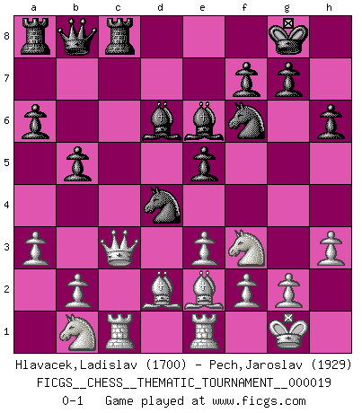 Last move : 0-1 2007 March 4 8:2:52 [Event "FICGS__CHESS__THEMATIC_TOURNAMENT__000019"] [Site "FICGS"] [Date "2006.12.15"] [Round "1"] [White "Hlavacek,Ladislav"] [Black "Pech,Jaroslav"] [Result "0-1"] [WhiteElo "1700"] [BlackElo "1929"] 1.Nc3 c5 2.d4 cxd4 3.Qxd4 Nc6 4.Qh4 d5 5.e3 Nf6 6.Nf3 e5 7.Bb5 Bd6 8.O-O O-O 9.Bd2 a6 10.Be2 Bf5 11.Rac1 h6 12.Rfe1 Ne7 13.Qa4 Qc7 14.h3 b5 15.Qb3 Rfc8 16.a3 Be6 17.Nb1 d4 18.c4 dxc3 19.Qxc3 Qb8 20.Qa5 Nc6 21.Qc3 Nd4 0-1 Novosibirsk Opening Kingside Castling by player White (move 8) Kingside Castling by player Black (move 8) Player Black won this chess game. Follow this game move after move (download)First-class players lose to second-class players because second-class players sometimes play a first-class game. (Siegbert Tarrasch) Die Fehler sind da, Sie warten nur darauf gemacht zu werden. (Savielly Grigorievitsch Tartakower) No puedes jugar al Ajedrez si eres de corazón noble. (Proverbio Francés) Soyez une menace à chaque fois que vous vous asseyez pour jouer. (Ken Smith) Life is like a play: it's not the length but the excellence of the acting that matters. (Seneca)