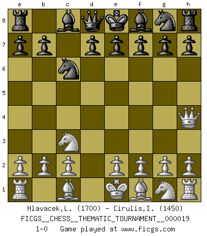 Last move : 1-0 2007 February 13 4:12:10 [Event "FICGS__CHESS__THEMATIC_TOURNAMENT__000019"] [Site "FICGS"] [Date "2006.12.15"] [Round "1"] [White "Hlavacek,Ladislav"] [Black "Cirulis,Ilmars"] [Result "1-0"] [WhiteElo "1700"] [BlackElo "1450"] 1.Nc3 c5 2.d4 cxd4 3.Qxd4 Nc6 4.Qh4 1-0 Novosibirsk Opening Player White won this chess game. Follow this game move after move (download)Chess is played with the mind and not with the hands ! (Renaud and Kahn) Der Verteidiger gebe der Gewalt nach, aber nur der Gewalt. Er schaffe sich nicht freiwillig, etwa aus Blindheit oder aus Schrecken, irgendwelche Schwächen. Er lasse sich nicht bluffen. (Emanuel Lasker) El juego del Ajedrez no es solamente una diversión quieta; algunas cualidades muy valuables de la mente se pueden adquirir y cultivar con el, como convertirlos en habitos disponibles para toda ocasión; ya que la vida es algo así como el Ajedrez. (Benjamin Franklin) Horreur, mais aussi harmonie suprême : qu'y avait-il en effet au monde en dehors des échecs ? Le brouillard, l'inconnu, le non-être... (Vladimir Nabokov) Perception is reality. (Immanuel Kant)