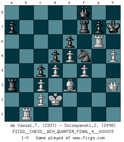Last move : 1-0 2011 May 29 17:41:55 [Event "FICGS__CHESS__WCH_QUARTER_FINAL_4__000009"] [Site "FICGS"] [Date "2011.04.01"] [Round "4"] [White "de Vassal,Thibault"] [Black "Szczepanski,Zbigniew"] [Result "1-0"] [WhiteElo "2337"] [BlackElo "2498"] 1.e4 e6 2.d4 d5 3.Nc3 Bb4 4.e5 c5 5.a3 Bxc3+ 6.bxc3 Ne7 7.Qg4 O-O 8.Bd3 c4 9.Bh6 Ng6 10.Bxg6 fxg6 11.Be3 Bd7 12.h4 Rf5 13.Ne2 Nc6 14.Ng3 h5 15.Qh3 Rf7 16.Ne2 Ne7 17.g4 Qf8 18.f4 Rc8 19.Kd2 Rc6 20.Ng3 Ra6 21.Rhb1 b5 22.Rg1 Be8 23.gxh5 gxh5 24.Nxh5 Nf5 25.Nf6+ Kh8 26.Nxe8 Qxe8 27.h5 Qf8 28.Rg6 Rxa3 29.Rb1 b4 30.Rxb4 Kh7 31.Rb1 1-0 Comment by player 1 : Thibault de Vassal : Hello Zbigniew... Really, I apologize for what just happened. Indeed I said "I offer draw" by playing 29.Rb1 and I forgot to check the draw offer box. It happened to me once already, and to other players too, there was at least one discussion on that issue in the forum... Sorry that the game turned this way, I did not expect that. At the end I guess that moves & rules prevail but of course I'm not proud :( Best regards, Thibault French : Winawer, Advance, poisoned pawn variation Kingside Castling by player Black (move 7) Player White won this chess game. Follow this game move after move (download)You sit at the board and suddenly your heart leaps. Your hand trembles to pick up the piece and move it. But what Chess teaches you is that you must sit there calmly and think about whether it's really a good idea and whether there are other better ideas. (Stanley Kubrick) Taktik ist was man tun muß, wenn etwas zu tun ist. Strategie ist was man tun muß, wenn nichts zu tun ist. (Savielly Grigorievitsch Tartakower) El Ajedrez es sobre todo, ¡una pelea!. (Emanuel Lasker) Je ne suis pas le dernier à jouer lâchement des coups douteux pendant le zeïtnot de l'adversaire pour l'achever: en effet les coups qui font le plus peur sont ceux que l'on ne comprend pas. Je me fais souvent peur quand je joue. (Un professeur anonyme) Chess is as much a mystery as women. (Purdy)