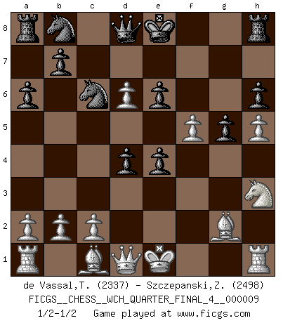 Last move : 1/2-1/2 2011 April 17 11:35:0 [Event "FICGS__CHESS__WCH_QUARTER_FINAL_4__000009"] [Site "FICGS"] [Date "2011.04.01"] [Round "6"] [White "de Vassal,Thibault"] [Black "Szczepanski,Zbigniew"] [Result "1/2-1/2"] [WhiteElo "2337"] [BlackElo "2498"] 1.e4 c6 2.d4 d5 3.e5 Bf5 4.Nc3 e6 5.g4 Bg6 6.Nge2 Ne7 7.Nf4 c5 8.h4 cxd4 9.Nb5 Nec6 10.h5 Be4 11.f3 a6 12.Nd6+ Bxd6 13.exd6 g5 14.Nh3 h6 15.fxe4 dxe4 16.Bg2 f5 17.gxf5 1/2-1/2 Caro-Kann : Advance variation This chess game ended in a draw. Follow this game move after move (download)Chess is like war on a board. (Bobby Fischer) Ich kämpfe solange mein Gegner einen Fehler machen kann. (Emanuel Lasker) Solo existe una cosa que Fischer hace en el Ajedrez sin placer: ¡perder!. (Boris Spassky) Il n'y a pas eu de défaite parce que je ne crois pas que cet ordinateur ait jamais existé. IBM a triché en refusant d'imprimer les modes de recherche de la machine. C'est évident, pendant le match, des coups décisifs ont été joués par des êtres humains. Aujourd'hui, les meilleurs spécialistes en informatique ne peuvent toujours pas expliquer comment Deep-Blue a pu jouer contre la logique des ordinateurs. IBM a gagné une guerre de communication, mais ils sont incapables de prouver que l'ordinateur a gagné tout seul. (Garry Kasparov) There's no money in correspondence chess. (John Knudsen)