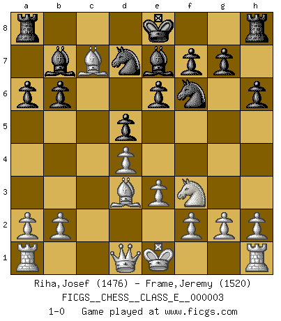 Last move : 1-0 2006 May 5 22:40:34 [Event "FICGS__CHESS__CLASS_E__000003"] [Site "FICGS"] [Date "2006.05.02"] [Round "1"] [White "Riha,Josef"] [Black "Frame,Jeremy"] [Result "1-0"] [WhiteElo "1476"] [BlackElo "1520"] 1.d4 d5 2.c4 e6 3.Nc3 Nf6 4.Bg5 Be7 5.e3 c6 6.Bd3 Nbd7 7.Nf3 h6 8.Bh4 b6 9.Bg3 Bb7 10.cxd5 cxd5 11.Nb5 a6 12.Nc7+ Qxc7 13.Bxc7 1-0 QGD : 4.Bg5 Be7 Player White won this chess game. Follow this game move after move (download)Suddenly it was obvious to me in my analysis I had missed what Fischer had found with the greatest of ease at the board. (Mikhail Botvinnik) Die unerbitterlichsten Regeln im Schach sind die Ausnahmen. (Savielly Grigorievitsch Tartakower) La maestría del Ajedrez consiste esencialmente en analizar posiciónes de Ajedrez con precisión. (Mikhail Botvinnik) Les pièces de l'échiquier étaient impitoyables. Elles le retenaient, elles l'absorbaient. Il y avait de l'horreur en cela, mais aussi une harmonie unique. Car, qu'y a-t-il dans le monde, à part les échecs ? (V. Nabokov) The quality of decision is like the well-timed swoop of a falcon which enables it to strike and destroy its victim. (Sun Tzu)