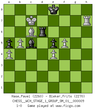Last move : 1-0 2011 August 21 7:49:30 [Event "FICGS__CHESS__WCH_STAGE_1_GROUP_SM_01__000009"] [Site "FICGS"] [Date "2011.04.01"] [Round "1"] [White "Hase,Pavel"] [Black "Bleker,Frits"] [Result "1-0"] [WhiteElo "2260"] [BlackElo "2270"] 1.e4 c5 2.Nf3 d6 3.d4 cxd4 4.Nxd4 Nf6 5.Nc3 a6 6.Bg5 e6 7.Qd2 h6 8.Bxf6 Qxf6 9.O-O-O Nc6 10.Nb3 Qd8 11.Kb1 Be7 12.f4 b5 13.Qe3 Qc7 14.Bd3 b4 15.Ne2 a5 16.Nbd4 Bd7 17.f5 Nxd4 18.Nxd4 e5 19.Nb5 Qb7 20.c4 bxc3 21.Nxc3 Rb8 22.Qe2 Bc6 23.Bc4 O-O 24.Nd5 Bxd5 25.Bxd5 Qb5 26.Qxb5 Rxb5 27.Rc1 Rfb8 28.b3 Rc5 29.Rxc5 dxc5 30.Kc2 Bg5 31.h4 Be7 32.Kc3 Kf8 33.g4 Kg8 34.a3 Kf8 35.Kc4 Kg8 36.Rh2 Rb6 37.Rg2 Bxh4 38.Kxc5 Bd8 39.b4 Kf8 40.b5 Rb8 41.Rb2 Bb6+ 42.Kd6 Rd8+ 43.Kc6 Rb8 44.a4 Ke7 45.Rb1 Kf6 46.Rd1 Ke7 47.Bb3 Bd4 48.Kc7 Rd8 49.Rc1 Rd7+ 50.Kc8 Rd8+ 51.Kb7 Rd6 52.Rc7+ Kd8 53.Rxf7 g6 54.Rf8+ Ke7 55.Rh8 Bc5 56.Bd5 gxf5 57.gxf5 Be3 58.Rh7+ Kf8 59.Kc7 Bc5 60.Be6 h5 61.Bd5 h4 62.Rxh4 Ke7 63.Rh7+ Kf8 64.Rf7+ Ke8 65.Rg7 Kf8 66.Rh7 Ke8 67.Bc6+ 1-0 Sicilian : Najdorf, 6...e6 Queenside Castling by player White (move 9) Kingside Castling by player Black (move 23) Player White won this chess game. Follow this game move after move (download)Chess is as much a mystery as women. (Purdy) Über Kasparov: Es ist offensichtlich, daß er in einem totalitären Staat aufwuchs und deshalb zu diktatorischen Zügen neigt. (Viktor Kortschnoi) Siempre es mucho mejor sacrificar las piezas de tu oponente. (Savielly Tartakover) Le pion, dans sa simplicité, marche droit devant lui, mais lorsqu'il prend, il le fait obliquement? Ainsi l'homme, tant qu'il reste pauvre, marche dans la droiture et vit honnêtement, mais lorsqu'il recherche les honneurs, il flatte, se parjure et, par les voies obliques, cherche une position supérieure sur l'échiquier du monde. (Jean de Galles) To send light into the darkness of men's hearts - such is the duty of the artist. (Schumann)