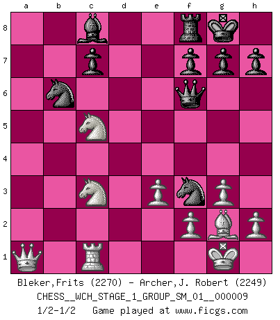 Last move : 1/2-1/2 2011 June 17 12:33:19 [Event "FICGS__CHESS__WCH_STAGE_1_GROUP_SM_01__000009"] [Site "FICGS"] [Date "2011.04.01"] [Round "1"] [White "Bleker,Frits"] [Black "Archer,J. Robert"] [Result "1/2-1/2"] [WhiteElo "2270"] [BlackElo "2249"] 1.Nf3 d5 2.d4 Nf6 3.c4 e6 4.g3 dxc4 5.Bg2 Nc6 6.Qa4 Bb4+ 7.Bd2 Nd5 8.Bxb4 Ndxb4 9.Nc3 Bd7 10.O-O a5 11.Qd1 Nd5 12.e3 Nb6 13.Nd2 a4 14.b3 axb3 15.axb3 cxb3 16.Nxb3 O-O 17.Nc5 Rxa1 18.Qxa1 Bc8 19.Rc1 e5 20.dxe5 Nxe5 21.Nxb7 Qf6 22.Nc5 Nf3+ 1/2-1/2 Reti Opening Kingside Castling by player White (move 10) Kingside Castling by player Black (move 16) This chess game ended in a draw. Follow this game move after move (download)Chess is not like life... it has rules ! (Mark Pasternak) Wenn Capablanka heute auf der Schachbühne erscheinen würde, hätte er ein halbes Jahr gebraucht um sich die Schachtheorie anzueignen. Und dann hätte er alles und jeden besiegt. (Mikhail Moiseyevich Botvinik) El jugador táctico debe saber que hacer cuando algo se debe de hacer. El estratégico debe saber que hacer cuando nada se debe de hacer. (Savielly Tartakover) Psychologiquement, tu dois avoir confiance en toi même, mais cette confiance doit être basée sur des faits. (Robert Fischer) A bird doesn't sing because it has an answer, it sings because it has a song. (Maya Angelou)