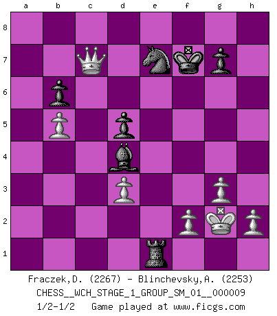 Last move : 1/2-1/2 2011 August 13 12:18:52 [Event "FICGS__CHESS__WCH_STAGE_1_GROUP_SM_01__000009"] [Site "FICGS"] [Date "2011.04.01"] [Round "1"] [White "Fraczek,Dariusz"] [Black "Blinchevsky,Alexander"] [Result "1/2-1/2"] [WhiteElo "2267"] [BlackElo "2253"] 1.e4 c6 2.d4 d5 3.e5 Bf5 4.Nf3 e6 5.Be2 Nd7 6.O-O Ne7 7.Nbd2 h6 8.Nb3 Qc7 9.a4 a6 10.Bd2 c5 11.dxc5 Nxc5 12.Ba5 b6 13.Nxc5 Qxc5 14.Bc3 Qc7 15.Nd4 Bg6 16.Bd3 Bxd3 17.cxd3 Ng6 18.Qg4 h5 19.Qg3 h4 20.Qg4 h3 21.g3 Qb7 22.Rfe1 Rc8 23.Rac1 Bc5 24.b4 Be7 25.b5 axb5 26.axb5 Ba3 27.Rc2 O-O 28.Qxh3 Rxc3 29.Rxc3 Bb2 30.Nxe6 Bxc3 31.Ng5 Re8 32.e6 Bf6 33.exf7+ Qxf7 34.Nxf7 Rxe1+ 35.Kg2 Kxf7 36.Qd7+ Ne7 37.Qc7 Bd4 38.Qf4+ Bf6 39.Qc7 Bd4 1/2-1/2 Caro-Kann : Advance variation Kingside Castling by player White (move 6) Kingside Castling by player Black (move 27) This chess game ended in a draw. Follow this game move after move (download)When I asked Fischer why he had not played a certain move in our game, he replied: 'Well, you laughed when I wrote it down !' (Mikhail Tal) Korrekt heißt in Deutschland die Haltung eines Mannes, dessen Benehmen nach dem Urteile seiner Nachbarn seiner Stellung angemessen ist. Um korrekt zu sein, muß man sich der Meinung der anderen anpassen... (Emanuel Lasker) El Ajedrez es una guerra en un tablero. El objetivo es aplastar la mente del oponente. (Bobby Fischer) A chaque perte on perd un peu de soi. (Joël Lautier) I know the human being and fish can coexist peacefully. (George W. Bush, Saginaw sept. 29, 2000)