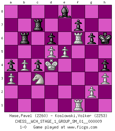 Last move : 1-0 2011 July 5 7:50:30 [Event "FICGS__CHESS__WCH_STAGE_1_GROUP_SM_01__000009"] [Site "FICGS"] [Date "2011.04.01"] [Round "1"] [White "Hase,Pavel"] [Black "Koslowski,Volker"] [Result "1-0"] [WhiteElo "2260"] [BlackElo "2253"] 1.e4 e5 2.Nf3 Nc6 3.Bb5 a6 4.Ba4 Nf6 5.O-O Be7 6.Re1 b5 7.Bb3 d6 8.c3 O-O 9.h3 Nb8 10.d4 Nbd7 11.Nbd2 Bb7 12.Bc2 c5 13.d5 c4 14.Nf1 Qc7 15.Ng3 g6 16.Nh2 Nc5 17.Ng4 a5 18.Nh6+ Kg7 19.b3 Ng8 20.Nxg8 Kxg8 21.Bd2 Rab8 22.Qf3 Rfe8 23.b4 axb4 24.cxb4 Na4 25.Bxa4 bxa4 26.Rac1 Ba6 27.Nf1 Rec8 28.a3 h5 29.Ne3 Qd7 30.Nd1 Kg7 31.Nc3 Bd8 32.Be3 Rb7 33.Qd1 Bb5 34.Rf1 Bf6 35.f4 exf4 36.Rxf4 Be5 37.Rf3 Qe7 38.Qd2 Be8 39.Bf4 Kg8 40.Rcf1 Bh8 41.Bg5 Qe5 42.Bf6 Bxf6 43.Rxf6 Kg7 44.R1f3 Rd8 45.Qf4 Qxf4 46.R3xf4 Rb6 47.Kf2 Rd7 48.Ke3 Rdb7 49.Kd4 Rc7 50.Rf2 Kh6 51.Rf1 h4 52.e5 1-0 Ruy Lopez : Closed Kingside Castling by player White (move 5) Kingside Castling by player Black (move 8) Player White won this chess game. Follow this game move after move (download)Combinations have always been the most intriguing aspect of Chess. The masters look for them, the public applauds them, the critics praise them. It is because combinations are possible that Chess is more than a lifeless mathematical exercise. They are the poetry of the game; they are to Chess what melody is to music. They represent the triumph of mind over matter. (Reuben Fine) Schach ist wie eine schöne Frau, zu der wir ständig zurückkehren, gleichviel, wie oft sie uns zurückweist. (Anonymous) El Jaque al descubierto es el bombardero del tablero. (Reuben Fine) Je ne suis pas le dernier à jouer lâchement des coups douteux pendant le zeïtnot de l'adversaire pour l'achever: en effet les coups qui font le plus peur sont ceux que l'on ne comprend pas. Je me fais souvent peur quand je joue. (Un professeur anonyme) Life is like a game of cards: the hand you are dealt represents determinism; the way you play it is free will. (Jawaharlal Nehru)