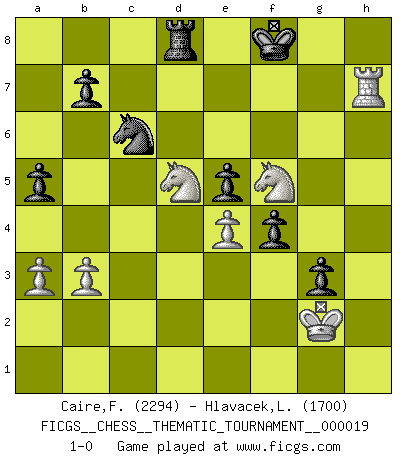 Last move : 1-0 2007 February 14 14:46:49 [Event "FICGS__CHESS__THEMATIC_TOURNAMENT__000019"] [Site "FICGS"] [Date "2006.12.15"] [Round "1"] [White "Caire,Francois"] [Black "Hlavacek,Ladislav"] [Result "1-0"] [WhiteElo "2294"] [BlackElo "1700"] 1.Nc3 c5 2.d4 cxd4 3.Qxd4 Nc6 4.Qh4 d5 5.e4 d4 6.Nd5 e6 7.Qxd8+ Kxd8 8.Nf4 Bb4+ 9.Bd2 Bxd2 10.Kxd2 Nf6 11.Bd3 e5 12.Nfe2 Re8 13.h3 Ke7 14.c3 dxc3+ 15.Nxc3 Be6 16.Nf3 Red8 17.Ke3 h6 18.Rhd1 a6 19.Rac1 Rac8 20.Bb1 g5 21.g4 Ra8 22.a3 Bb3 23.Rxd8 Rxd8 24.Bc2 Be6 25.Bd3 Rc8 26.Ne2 Bxg4 27.hxg4 Nxg4+ 28.Kd2 Nxf2 29.Rf1 Nxd3 30.Kxd3 f6 31.Nc3 Ke6 32.Nd5 Rd8 33.Nd2 f5 34.Rh1 Kf7 35.Rxh6 Kg7 36.Re6 g4 37.Nc4 g3 38.Nce3 f4 39.Nf5+ Kg8 40.Ke2 a5 41.b3 Kf7 42.Rf6+ Kg8 43.Kf3 Rb8 44.Rg6+ Kf7 45.Rg7+ Kf8 46.Rh7 Rd8 47.Kg2 1-0 Novosibirsk Opening Player White won this chess game. Follow this game move after move (download)Those who say they understand Chess, understand nothing. (Robert Hubner) Besser ein falscher Plan, logisch durchgeführt, als gar kein Plan. (Viktor Kortschnoi) Dios mío, Bobby Fischer juega tan simple. (Alexei Suetin) Une platitude souvent récitée à propos des Echecs est qu'une des choses les plus difficiles à réaliser est de gagner une position gagnante. Cela ne manque pas de sens mais, pour ma part, j'ai toujours trouvé plus difficile de gagner une position perdante. (Tim Krabbe) Remember : Your focus determines your reality. (Qui-Gon Jinn in Star Wars ep.1)