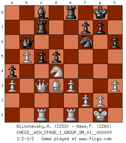 Last move : 1/2-1/2 2011 May 29 9:22:41 [Event "FICGS__CHESS__WCH_STAGE_1_GROUP_SM_01__000009"] [Site "FICGS"] [Date "2011.04.01"] [Round "1"] [White "Blinchevsky,Alexander"] [Black "Hase,Pavel"] [Result "1/2-1/2"] [WhiteElo "2253"] [BlackElo "2260"] 1.d4 Nf6 2.c4 e6 3.Nf3 d5 4.Nc3 Be7 5.Bg5 O-O 6.e3 h6 7.Bh4 b6 8.Be2 Bb7 9.Bxf6 Bxf6 10.cxd5 exd5 11.b4 c6 12.O-O Re8 13.Qb3 a5 14.b5 c5 15.dxc5 bxc5 16.Rad1 Bxc3 17.Qxc3 Nd7 18.Bd3 Qb6 19.Rc1 a4 20.Rfd1 Rec8 21.h3 Nf6 22.a3 Rc7 23.Nd4 Re8 24.Re1 Bc8 1/2-1/2 Queen's pawn game Kingside Castling by player Black (move 5) Kingside Castling by player White (move 12) This chess game ended in a draw. Follow this game move after move (download)Though most people love to look at the games of the great attacking masters, some of the most successful players in history have been the quiet positional players. They slowly grind you down by taking away your space, tying up your pieces, and leaving you with virtually nothing to do ! (Yasser Seirawan) Wenn du nicht weißt was du tun sollst, warte bis dein Gegner eine Idee hat. Sie wird sicher schlecht sein. (Siegbert Tarrasch) No hay precio que no valga la pena por la cabellera del Rey enemigo. (Koblentz) Aux échecs, l'amour-propre est satisfait quand on remporte la victoire, mais il n'y a pas de honte à être battu. (Benjamin Franklin) Wikichess, chess moves explained by 'experimented' players. (Thibault de Vassal)