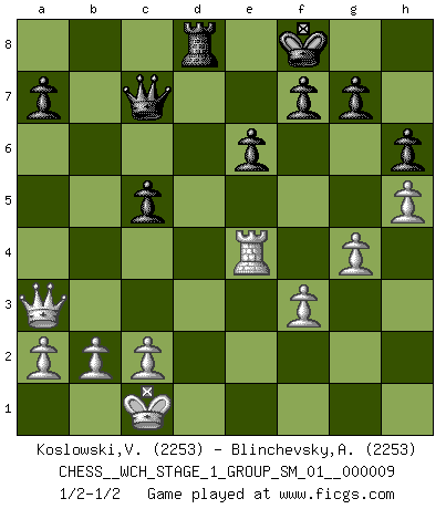 Last move : 1/2-1/2 2011 May 31 9:50:1 [Event "FICGS__CHESS__WCH_STAGE_1_GROUP_SM_01__000009"] [Site "FICGS"] [Date "2011.04.01"] [Round "1"] [White "Koslowski,Volker"] [Black "Blinchevsky,Alexander"] [Result "1/2-1/2"] [WhiteElo "2253"] [BlackElo "2253"] 1.e4 c6 2.d4 d5 3.Nc3 dxe4 4.Nxe4 Bf5 5.Ng3 Bg6 6.h4 h6 7.Nf3 Nd7 8.h5 Bh7 9.Bd3 Bxd3 10.Qxd3 e6 11.Bf4 Qa5+ 12.Bd2 Bb4 13.Ne4 Bxd2+ 14.Nfxd2 Ngf6 15.Nd6+ Ke7 16.Nxb7 Qb4 17.Qb3 Qxd4 18.O-O-O Rab8 19.Qa3+ c5 20.Na5 Rhc8 21.f3 Qf4 22.Nac4 Ne5 23.Nxe5 Qxe5 24.g4 Kf8 25.Rhe1 Qc7 26.Ne4 Nxe4 27.Rxe4 Rd8 28.Rxd8+ Rxd8 1/2-1/2 Caro-Kann : Classical, 7...Nd7 Queenside Castling by player White (move 18) This chess game ended in a draw. Follow this game move after move (download)Play the opening like a book, the middle game like a magician, and the endgame like a machine. (Spielmann) Ich hatte Zahnschmerzen im ersten Spiel. In der zweiten Partie tat mir der Kopf weh. In der dritten war es eine Rheuma-Attacke und während der vierten fühlte ich mich nicht gut. Und in der fünften? Nun, man muss doch nicht jedes Spiel gewinnen, oder? (Savielly Grigorievitsch Tartakower) Me siento como si fuera una pieza en una partida de Ajedrez, cuando mi oponente me indica: esa pieza no puede ser movida. (Soren Kierkegaard) Si je n'étais pas joueur d'échecs, je serais le meilleur dans quelque chose d'autre. (Anatoli Karpov) A journey of a thousand sites begins with a single click. (Author unknown)