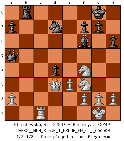 Last move : 1/2-1/2 2011 June 19 17:59:46 [Event "FICGS__CHESS__WCH_STAGE_1_GROUP_SM_01__000009"] [Site "FICGS"] [Date "2011.04.01"] [Round "1"] [White "Blinchevsky,Alexander"] [Black "Archer,J. Robert"] [Result "1/2-1/2"] [WhiteElo "2253"] [BlackElo "2249"] 1.d4 Nf6 2.c4 e6 3.Nf3 d5 4.Nc3 Be7 5.Bg5 h6 6.Bh4 O-O 7.e3 b6 8.Be2 Bb7 9.Bxf6 Bxf6 10.cxd5 exd5 11.b4 c5 12.bxc5 bxc5 13.Rb1 Bc6 14.O-O Nd7 15.Bb5 Qc7 16.Qd3 Rfc8 17.Rfc1 Rab8 18.Bxc6 Qxc6 19.Rxb8 Rxb8 20.dxc5 Qxc5 21.Ne2 Qa5 22.Nf4 d4 1/2-1/2 Queen's pawn game Kingside Castling by player Black (move 6) Kingside Castling by player White (move 14) This chess game ended in a draw. Follow this game move after move (download)Fischer prefers to enter Chess history alone. (Miguel Najdorf) Ich möchte Schüler heranbilden, die das Vermögen haben, selbst zu denken und Kritik zu üben. (Emanuel Lasker) Un entendimiento minucioso de las típicas continuaciones de mate hacen de las mas complicadas combinaciones de sacrificio que conducen hacia ellas no solo no dificiles, sino casi un asunto de rutina. (Siegbert Tarrasch) Une platitude souvent récitée à propos des Echecs est qu'une des choses les plus difficiles à réaliser est de gagner une position gagnante. Cela ne manque pas de sens mais, pour ma part, j'ai toujours trouvé plus difficile de gagner une position perdante. (Tim Krabbe) There's always a bigger fish. (Qui-Gon Jinn in Star Wars ep.1)