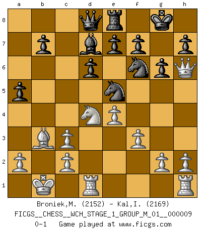 Last move : 0-1 2011 June 10 7:25:32 [Event "FICGS__CHESS__WCH_STAGE_1_GROUP_M_01__000009"] [Site "FICGS"] [Date "2011.04.01"] [Round "1"] [White "Broniek,Mariusz Maciej"] [Black "Kal,Izzak"] [Result "0-1"] [WhiteElo "2152"] [BlackElo "2169"] 1.e4 c5 2.Nf3 d6 3.d4 cxd4 4.Nxd4 Nf6 5.Nc3 g6 6.Be3 Bg7 7.f3 O-O 8.Qd2 Nc6 9.Bc4 Bd7 10.Bb3 Rc8 11.O-O-O Ne5 12.Kb1 Re8 13.Bh6 Bxh6 14.Qxh6 Rxc3 15.bxc3 a5 0-1 This chess game has been lost on time (started : 2011.04.01 9:36:12) Sicilian : Dragon, Yugoslav attack, 7...O-O Kingside Castling by player Black (move 7) Queenside Castling by player White (move 11) Player Black won this chess game. Follow this game move after move (download)If Chess is a science, it's a most inexact one. If Chess is an art, it is too exacting to be seen as one. If Chess is a sport, it's too esoteric. If Chess is a game, it's too demanding to be just a game. If Chess is a mistress, she's a demanding one. If Chess is a passion, it's a rewarding one. If Chess is life, it's a sad one. (Unknown) Es gibt zwei Arten von Opfern: Korrekte und meine. (Mikhail Nekhemyevich Tal) Cuando estes solo, cuando te sientas un extraño en el mundo, juega al Ajedrez. Esto levantará tu espiritu y será tu consejero de guerra. (Aristóteles) On est toujours la mazette de quelqu'un d'autre. (Anonyme) Luck is what you have left over after you give 100 percent. (Langston Coleman)