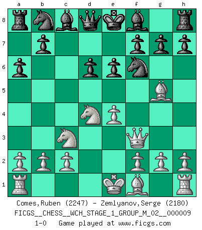 Last move : 1-0 2011 May 11 6:0:7 [Event "FICGS__CHESS__WCH_STAGE_1_GROUP_M_02__000009"] [Site "FICGS"] [Date "2011.04.01"] [Round "1"] [White "Comes,Ruben"] [Black "Zemlyanov,Serge"] [Result "1-0"] [WhiteElo "2247"] [BlackElo "2180"] 1.e4 c5 2.Nf3 d6 3.d4 cxd4 4.Nxd4 Nf6 5.Nc3 a6 6.Bg5 e6 7.Qf3 1-0 This chess game has been lost on time (started : 2011.04.01 9:50:27) Sicilian : Najdorf, 6...e6 Player White won this chess game. Follow this game move after move (download)Chess is a terrible game. If you have no center, your opponent has a freer position. If you do have a center, then you really have something to worry about ! (Siegbert Tarrasch) Schach ist mein Leben, meine Leidenschaft, was ich gelernt habe und seit meinem 14. Lebensjahr profimässig praktiziere. Darauf zu verzichten, würde mir sehr schwer fallen. (Viktor Kortschnoi) Nos gusta pensar. (Gary Kasparov) Le temps de noter son nom sur la feuille de partie, j'étais déjà en zeitnot ! D'un modeste amateur apparié lors de la première ronde d'un open contre le grand-maître Azmaïparashvili. Political correctness is subjecting us to gross incompetence. (Johann Piek)