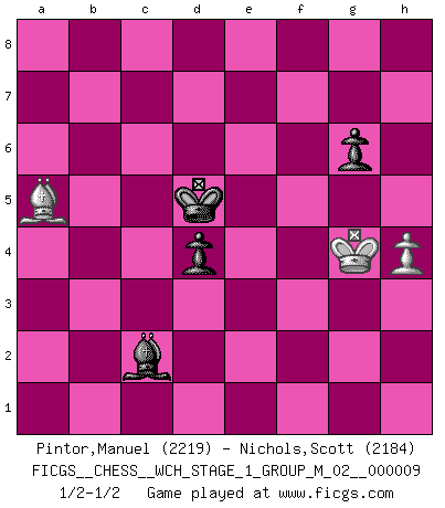 Last move : 1/2-1/2 2011 June 22 3:32:58 [Event "FICGS__CHESS__WCH_STAGE_1_GROUP_M_02__000009"] [Site "FICGS"] [Date "2011.04.01"] [Round "1"] [White "Pintor,Manuel"] [Black "Nichols,Scott"] [Result "1/2-1/2"] [WhiteElo "2219"] [BlackElo "2184"] 1.e4 c5 2.Nc3 d6 3.g3 Nc6 4.Bg2 g6 5.d3 Bg7 6.f4 Nf6 7.Nf3 O-O 8.h3 Rb8 9.O-O b5 10.Ne2 b4 11.Be3 Nd7 12.c3 Ba6 13.Qc2 bxc3 14.bxc3 Qa5 15.Rab1 Rb6 16.Bd2 Rfb8 17.Kh2 Bb5 18.c4 Ba4 19.Rxb6 axb6 20.Qc1 Qa6 21.Nc3 b5 22.e5 dxe5 23.Qa3 Rb6 24.fxe5 Ncxe5 25.Nxe5 Bxe5 26.Bf4 Bd4 27.Nd5 Bc2 28.Nxe7+ Kh8 29.Qxa6 Rxa6 30.cxb5 Rxa2 31.Nc6 Bxd3 32.Rd1 Be2 33.Bd5 Rb2 34.Rd2 Rxd2 35.Bxd2 Bxb5 36.Nxd4 cxd4 37.Bxf7 Kg7 38.Bd5 Kf6 39.Kg2 Nb6 40.Be4 Na4 41.Kf3 Nc5 42.Bd5 Bd7 43.h4 Be6 44.Ba8 Bb3 45.Kf4 Ne6+ 46.Ke4 Bc2+ 47.Kf3 Ke5 48.Bc6 Kd6 49.Be8 Nc5 50.Bb4 h5 51.Kf4 Kd5 52.Bf7+ Ne6+ 53.Bxe6+ Kxe6 54.g4 Kd5 55.Ba5 hxg4 56.Kxg4 1/2-1/2 Sicilian : Closed Kingside Castling by player Black (move 7) Kingside Castling by player White (move 9) 10 pieces endgame at move 53 : White KBBPP , Black KBPPP WHITE : King + 2 Bishops 2 Pawns BLACK : King + 1 Bishop 3 Pawns 9 pieces endgame at move 53 : White KBPP , Black KBPPP WHITE : King + 1 Bishop 2 Pawns BLACK : King + 1 Bishop 3 Pawns 8 pieces endgame at move 55 : White KBP , Black KBPPP WHITE : King + 1 Bishop 1 Pawn BLACK : King + 1 Bishop 3 Pawns 7 pieces endgame at move 56 : White KBP , Black KBPP WHITE : King + 1 Bishop 1 Pawn BLACK : King + 1 Bishop 2 Pawns This chess game ended in a draw. Follow this game move after move (download)Bobby Fischer is the greatest Chess genius of all time ! (Alexander Kotov) Alle Schachspieler sollten auch ein Hobby haben. (Savielly Grigorievitsch Tartakower) Me siento como si fuera una pieza en una partida de Ajedrez, cuando mi oponente me indica: esa pieza no puede ser movida. (Soren Kierkegaard) Le génie consiste à savoir transgresser les règles au moment opportun. (Teichmann) Once you start thinking you have nothing left to learn, you have everything to learn. (Steve Badget)