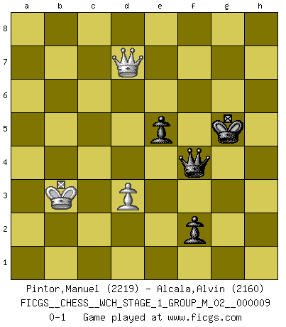 Last move : 0-1 2011 October 18 12:17:0 [Event "FICGS__CHESS__WCH_STAGE_1_GROUP_M_02__000009"] [Site "FICGS"] [Date "2011.04.01"] [Round "1"] [White "Pintor,Manuel"] [Black "Alcala,Alvin"] [Result "0-1"] [WhiteElo "2219"] [BlackElo "2160"] 1.e4 c5 2.Nc3 d6 3.g3 Nc6 4.Bg2 g6 5.d3 Bg7 6.f4 e6 7.Nf3 Nge7 8.O-O O-O 9.Be3 Nd4 10.e5 Nef5 11.Bf2 Nxf3+ 12.Qxf3 Nd4 13.Qd1 dxe5 14.fxe5 Bxe5 15.Na4 Nf5 16.c3 Rb8 17.Nxc5 b6 18.Qe2 Qc7 19.Nb3 h5 20.Rae1 Bg7 21.Nd4 Nxd4 22.Bxd4 Bxd4+ 23.cxd4 Bb7 24.Qe5 Rbc8 25.Qxc7 Rxc7 26.Rc1 Rxc1 27.Rxc1 Bxg2 28.Kxg2 Rd8 29.Rc4 b5 30.Rb4 Rd5 31.a4 bxa4 32.Rxa4 a5 33.Kf3 Rb5 34.Ra2 g5 35.b3 g4+ 36.Ke3 Kh7 37.Ra3 Kg6 38.Kd2 Rf5 39.Kc3 h4 40.Ra4 Kg5 41.Ra2 hxg3 42.hxg3 Rf3 43.Rxa5+ f5 44.b4 Rxg3 45.b5 Rg1 46.Ra2 g3 47.b6 Rc1+ 48.Rc2 Rb1 49.Rb2 Rxb2 50.Kxb2 g2 51.b7 g1Q 52.b8Q Qxd4+ 53.Kc2 Qe3 54.Qg8+ Kh4 55.Qg2 f4 56.Qh2+ Kg5 57.Qg2+ Kf6 58.Qh2 f3 59.Qh4+ Kg6 60.Qg3+ Kf7 61.Kc3 e5 62.Qh3 Qc1+ 63.Kb3 Qf4 64.Qh5+ Ke7 65.Qh1 f2 66.Qb7+ Kf6 67.Qc6+ Kf5 68.Qd7+ Kg5 0-1 This chess game has been lost on time (started : 2011.04.01 9:50:27) Sicilian : Closed Kingside Castling by player White (move 8) Kingside Castling by player Black (move 8) 10 pieces endgame at move 44 : White KRPPP , Black KRPPP WHITE : King + 1 Rook 3 Pawns BLACK : King + 1 Rook 3 Pawns 9 pieces endgame at move 49 : White KPPP , Black KRPPP WHITE : King + 3 Pawns BLACK : King + 1 Rook 3 Pawns 8 pieces endgame at move 50 : White KPPP , Black KPPP WHITE : King + 3 Pawns BLACK : King + 3 Pawns Promotion Queen by player Black (move 51) Promotion Queen by player White (move 52) 7 pieces endgame at move 52 : White KQP , Black KQPP WHITE : King + 1 Queen 1 Pawn BLACK : King + 1 Queen 2 Pawns Player Black won this chess game. Follow this game move after move (download)Pawn endings are to Chess what putting is to golf. (Cecil Purdy) Über Frauen: Chess is better. (Robert James Fischer) Bobby Fischer es el mas grande genio de Ajedrez de todos los tiempos. (Alexander Kotov) Je ne crois pas en la psychologie, je crois aux bons coups. (Robert Fischer) If you don't practice you don't deserve to win. (Andre Agassi)
