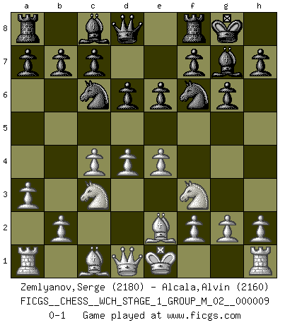 Last move : 0-1 2011 May 10 5:59:25 [Event "FICGS__CHESS__WCH_STAGE_1_GROUP_M_02__000009"] [Site "FICGS"] [Date "2011.04.01"] [Round "1"] [White "Zemlyanov,Serge"] [Black "Alcala,Alvin"] [Result "0-1"] [WhiteElo "2180"] [BlackElo "2160"] 1.d4 Nf6 2.c4 Nc6 3.Nf3 e6 4.a3 d6 5.Nc3 g6 6.e4 Bg7 7.Be2 O-O 0-1 This chess game has been lost on time (started : 2011.04.01 9:50:27) Kevitz-Trajkovich defense Kingside Castling by player Black (move 7) Player Black won this chess game. Follow this game move after move (download)The isolated Pawn casts gloom over the entire chessboard. (Aaron Nimzovich) Das Schachspiel ist ein See, in welchem eine Mücke baden und ein Elefant ertrinken kann. (Emanuel Lasker) El jugador blanco perdió porque fallo en recordar la coreccta continuación y tuvo que pensar por sí mismo las movidas. (Siegbert Tarrasch) Le plus grand jeu de l'esprit jamais inventé, plus vous l'apprenez, plus vous y prenez du plaisir. (Garry Kasparov) Games, world of games... There's always an opponent, and there's always a victim. (Revolver, movie)