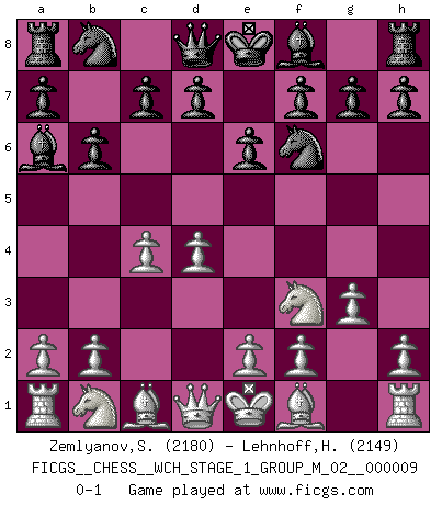 Last move : 0-1 2011 May 8 17:42:58 [Event "FICGS__CHESS__WCH_STAGE_1_GROUP_M_02__000009"] [Site "FICGS"] [Date "2011.04.01"] [Round "1"] [White "Zemlyanov,Serge"] [Black "Lehnhoff,Heinz-Georg"] [Result "0-1"] [WhiteElo "2180"] [BlackElo "2149"] 1.d4 Nf6 2.c4 e6 3.Nf3 b6 4.g3 Ba6 0-1 This chess game has been lost on time (started : 2011.04.01 9:50:27) Queen's Indian : Nimzovich variation (exaggerated Fianchetto) Player Black won this chess game. Follow this game move after move (download)Fischer Chess play was always razor-sharp, rational and brilliant. One of the best ever. (Dave Regis) Verschiedene, sehr schätzbare und im Laufe des Lebens nützliche Eigenschaften des Geistes können durch das Schachspiel erworben und gekräftigt werden, so dass sie zu Gewohnheiten werden, die uns nie im Stich lassen. (Benjamin Franklin) Combinaciones deslumbrantes son para la mayoría, mover madera es para los pocos. (Georg Kieninger) J'apprécie les joueurs d'est-indienne, c'est grâce à eux que je nourris ma famille depuis tant d'années. (Petrosian) Big Chess is a place for big hallucinations. (Thibault de Vassal)