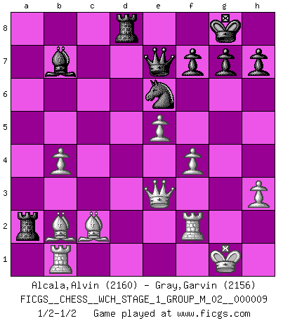 Last move : 1/2-1/2 2011 August 18 18:50:47 [Event "FICGS__CHESS__WCH_STAGE_1_GROUP_M_02__000009"] [Site "FICGS"] [Date "2011.04.01"] [Round "1"] [White "Alcala,Alvin"] [Black "Gray,Garvin"] [Result "1/2-1/2"] [WhiteElo "2160"] [BlackElo "2156"] 1.e4 e5 2.Nf3 Nc6 3.Bb5 a6 4.Ba4 Nf6 5.O-O Be7 6.Re1 b5 7.Bb3 O-O 8.h3 d6 9.c3 Nb8 10.d4 Nbd7 11.Nbd2 Bb7 12.Bc2 Re8 13.Nf1 d5 14.Nxe5 Nxe5 15.dxe5 Nxe4 16.f3 Nc5 17.b4 Nd7 18.f4 c5 19.a3 Nf8 20.Ne3 cxb4 21.cxb4 a5 22.Rb1 axb4 23.axb4 d4 24.Nf5 Ra2 25.Qd3 Qc7 26.Re2 Bd5 27.Rf2 Rd8 28.Nxe7+ Qxe7 29.Qxb5 d3 30.Qxd3 Bxg2 31.Qc3 Bb7 32.Bb2 Ne6 33.Qe3 1/2-1/2 Ruy Lopez : Closed, 7...O-O Kingside Castling by player White (move 5) Kingside Castling by player Black (move 7) This chess game ended in a draw. Follow this game move after move (download)Botvinnik tried to take the mystery out of Chess, always relating it to situations in ordinary life. He used to call Chess a typical inexact problem similar to those which people are always having to solve in everyday life. (Garry Kasparov) Schach ist ein Kampf gegen den Fehler. (Johannes Herrman Zukertort) Un juego de Ajedrez es un dialogo, una conversación entre un jugador y su oponente. Cada movimiento del oponente puede contener amenazas o tropiezos, pero un jugador no se puede defender de las amenazas o tomar ventaja de los tropiezos si es que no se pregunta a sí mismo: ¿Que es lo que mi oponente va a hacer después de cada movida?. (Bruce A. Moon) Les réformistes prétendent que les progrès de la théorie conduiront à la disparition des échecs, et qu'il faut, pour leur rendre vie, en remanier les règles. En réalité, qu'exprime cette affirmation? Le mépris de l'intuition, de l'imagination et de tous les autres éléments qui font des échecs un art. (Alexander Alekhine) Luck is when opportunity knocks and you answer. (Anonymous)