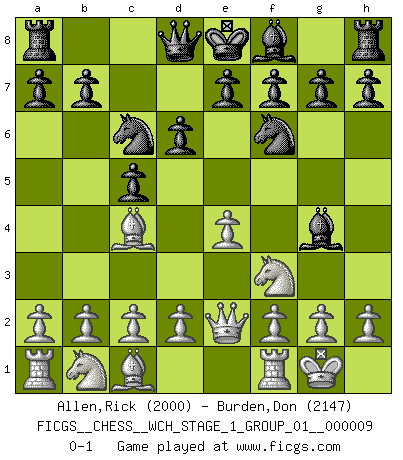 Last move : 0-1 2011 May 26 18:46:18 [Event "FICGS__CHESS__WCH_STAGE_1_GROUP_01__000009"] [Site "FICGS"] [Date "2011.04.01"] [Round "1"] [White "Allen,Rick"] [Black "Burden,Don"] [Result "0-1"] [WhiteElo "2000"] [BlackElo "2147"] 1.e4 c5 2.Nf3 d6 3.Bc4 Nf6 4.Qe2 Nc6 5.O-O Bg4 0-1 This chess game has been lost on time (started : 2011.04.01 9:56:54) Sicilian Kingside Castling by player White (move 5) Player Black won this chess game. Follow this game move after move (download)Chess is a cold bath for the mind. (Sir John Simon) Der vorletzte Fehler gewinnt. (Savielly Grigorievitsch Tartakower) Debemos de asegurarnos de que el Ajedrez no se convierta en un lenguaje muerto, muy interesante, pero solo para un grupo muy pequeño. (Sytze Faber) Ce qui est bien, c'est d'avoir tout un tas de pièces en prise : l'adversaire ne peut en prendre qu'une à la fois. Cité par Thierry Audin. Computers have lots of memory but no imagination. (Anonymous)