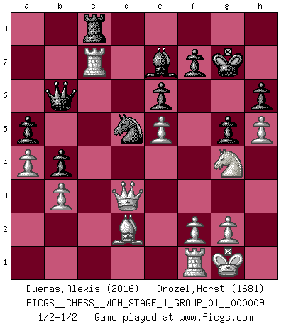 Last move : 1/2-1/2 2011 June 30 11:5:14 [Event "FICGS__CHESS__WCH_STAGE_1_GROUP_01__000009"] [Site "FICGS"] [Date "2011.04.01"] [Round "1"] [White "Duenas,Alexis"] [Black "Drozel,Horst"] [Result "1/2-1/2"] [WhiteElo "2016"] [BlackElo "1681"] 1.d4 d5 2.c4 c6 3.e3 Nf6 4.Nf3 e6 5.Nc3 Nbd7 6.Bd3 dxc4 7.Bxc4 b5 8.Bd3 Bb7 9.e4 b4 10.Na4 c5 11.e5 Nd5 12.Nxc5 Nxc5 13.dxc5 Bxc5 14.Qa4+ Ke7 15.O-O h6 16.Ba6 Bxa6 17.Qxa6 Rc8 18.Bd2 Qb6 19.Qd3 g6 20.a4 a5 21.Rac1 Rc7 22.h4 Kf8 23.h5 g5 24.Nh2 Kg7 25.Ng4 Rhc8 26.b3 Be7 27.Rxc7 1/2-1/2 QGD Slav defense Kingside Castling by player White (move 15) This chess game ended in a draw. Follow this game move after move (download)When you are lonely, when you feel yourself an alien in the world, play Chess. This will raise your spirits and be your counselor in war. (Aristotle) Dein Körper muss in Topform sein. Dein Schach verfällt, wenn dein Körper verfällt. Der Körper kann nicht vom Geist getrennt werden. (Robert James Fischer) El arma más poderosa en el Ajedrez, es tener la próxima movida. (David Bronstein) Plusieurs personnes se sont demandées comment Tal faisait pour gagner... En fait, c'est très simple ! Il met ses pièces au centre de l'échiquier et les sacrifie quelque part ! (David Bronstein) Optimism is a variety of information deficit. Sometimes especially true for correspondence chess games. (Michael Aigner)