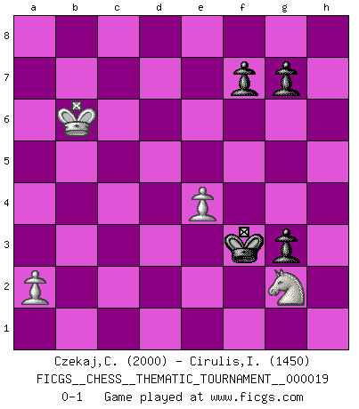 Last move : 0-1 2007 October 16 13:30:10 [Event "FICGS__CHESS__THEMATIC_TOURNAMENT__000019"] [Site "FICGS"] [Date "2006.12.15"] [Round "1"] [White "Czekaj,Christophe"] [Black "Cirulis,Ilmars"] [Result "0-1"] [WhiteElo "2000"] [BlackElo "1450"] 1.Nc3 c5 2.d4 cxd4 3.Qxd4 Nc6 4.Qh4 d5 5.e3 Bf5 6.Nf3 Bxc2 7.Bb5 e6 8.Qxd8+ Kxd8 9.Bxc6 bxc6 10.Ne5 Bg6 11.Nxc6+ Kc7 12.Ne5 Nf6 13.Nxg6 hxg6 14.b3 Rc8 15.Bb2 Kd7 16.O-O Bd6 17.h3 Be5 18.Rfc1 g5 19.f3 Rc6 20.Rab1 Rhc8 21.Nd1 Bxb2 22.Rxc6 Rxc6 23.Rxb2 e5 24.Kf1 Ke6 25.Ke2 e4 26.Kd2 exf3 27.gxf3 Nd7 28.Ke2 Rc1 29.Kd2 Rc8 30.Nf2 Ne5 31.Ke2 Rc1 32.Rd2 a5 33.e4 d4 34.Rxd4 Re1+ 35.Kxe1 Nxf3+ 36.Ke2 Nxd4+ 37.Kd3 Nf3 38.Kc4 Ke5 39.Kb5 Kf4 40.Kxa5 Kg3 41.Nd3 Kxh3 42.b4 g4 43.b5 g3 44.Nf4+ Kg4 45.Ng2 Ne5 46.b6 Nc4+ 47.Kb5 Nxb6 48.Kxb6 Kf3 0-1 Novosibirsk Opening Kingside Castling by player White (move 16) 10 pieces endgame at move 41 : White KNPPP , Black KNPPP WHITE : King + 1 Knight 3 Pawns BLACK : King + 1 Knight 3 Pawns 9 pieces endgame at move 47 : White KNPP , Black KNPPP WHITE : King + 1 Knight 2 Pawns BLACK : King + 1 Knight 3 Pawns 8 pieces endgame at move 48 : White KNPP , Black KPPP WHITE : King + 1 Knight 2 Pawns BLACK : King + 3 Pawns Player Black won this chess game. Follow this game move after move (download)All my games are real. (Bobby Fischer) Schach ist ein Reich, wo sich die menschliche Phantasie frei entfalten kann. (David Bronstein) El Ajedrez, como la música, como el amor, tiene el poder de hacer feliz a la gente. (Siegbert Tarrasch) Les échecs, c'est la lutte contre l'erreur. (Johannes Zukertort) Thibault, I ask for draw. Game 13876. - Sorry Ilmars, you won. (FICGS chat)