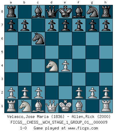Last move : 1-0 2011 May 6 17:37:13 [Event "FICGS__CHESS__WCH_STAGE_1_GROUP_01__000009"] [Site "FICGS"] [Date "2011.04.01"] [Round "1"] [White "Velasco,Jose Maria"] [Black "Allen,Rick"] [Result "1-0"] [WhiteElo "1836"] [BlackElo "2000"] 1.e4 c5 2.Nf3 Nc6 3.d4 cxd4 4.Nxd4 1-0 This chess game has been lost on time (started : 2011.04.01 9:56:54) Sicilian defense Player White won this chess game. Follow this game move after move (download)A chess genius has died; a loss for humanity. (Viktor Kortchnoi, about Bobby Fischer's death) Die Elozahlen sind sehr schlecht für das Schach. Jetzt ist Schach eine Sportindustrie, die darauf zielt Elopunkte zu machen. (Miguel Najdorf) Haz el enroque temprano y seguido. (Rob Sillars) Pour se monter efficace, un Cavalier a besoin d'avant-postes ! Les Cavaliers font les meilleurs bloqueurs de pions passés. Lottery : A tax on people who are bad at math. (Author unknown)
