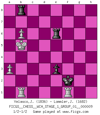 Last move : 1/2-1/2 2011 July 13 9:55:24 [Event "FICGS__CHESS__WCH_STAGE_1_GROUP_01__000009"] [Site "FICGS"] [Date "2011.04.01"] [Round "1"] [White "Velasco,Jose Maria"] [Black "Lommler,Jan Peter"] [Result "1/2-1/2"] [WhiteElo "1836"] [BlackElo "1682"] 1.e4 c5 2.Nf3 d6 3.d4 cxd4 4.Nxd4 Nf6 5.Nc3 a6 6.Be3 e5 7.Nb3 Be6 8.f3 Nbd7 9.Qd2 Be7 10.O-O-O O-O 11.g4 b5 12.g5 b4 13.Ne2 Ne8 14.f4 a5 15.f5 a4 16.Nbd4 b3 17.Kb1 exd4 18.Nxd4 bxc2+ 19.Nxc2 Nc7 20.fxe6 Nxe6 21.h4 Ne5 22.Nb4 Rb8 23.Be2 Qd7 24.a3 Qb7 25.Qd5 Nc5 26.Bd4 Rfe8 27.Rhe1 Bf8 28.Qxb7 Rxb7 29.Ka2 Reb8 30.Na6 Nxa6 31.Bxa6 Rb3 32.Bc3 g6 33.Rf1 R3b6 34.Be2 Bg7 35.Rf2 Rc8 36.h5 Nc6 37.Bxg7 Kxg7 38.Kb1 Nd8 39.Rd4 Ne6 40.Rxa4 Nxg5 41.hxg6 hxg6 42.Rc4 Re8 43.Bd3 Rb3 44.Rd4 Rb6 45.b4 Ne6 46.Rc4 Reb8 47.Rc3 R6b7 48.Kb2 g5 49.Bc4 Re7 50.Rg2 Kf6 51.Bxe6 fxe6 52.Rcg3 Ke5 53.Rxg5+ Kxe4 54.Re2+ Kd3 55.Re1 e5 56.Rd1+ Ke2 57.Rxd6 Rf8 58.Rg1 e4 59.R6d1 Rf4 60.b5 e3 61.Kc3 Rc7+ 62.Kb3 Re4 63.Rge1+ Kf2 64.Rf1+ Ke2 65.Rb1 Rc5 66.b6 Re6 67.Rfe1+ Kf2 68.Kb4 Rc8 69.Rf1+ Ke2 70.Rfe1+ Kf2 71.Ka5 Ra8+ 72.Kb5 Rb8 73.Rf1+ Ke2 74.Rfe1+ Kf2 75.Rf1+ 1/2-1/2 Sicilian : Najdorf, Byrne (English) attack Queenside Castling by player White (move 10) Kingside Castling by player Black (move 10) 10 pieces endgame at move 53 : White KRRPP , Black KRRPP WHITE : King + 2 Rooks 2 Pawns BLACK : King + 2 Rooks 2 Pawns 9 pieces endgame at move 57 : White KRRPP , Black KRRP WHITE : King + 2 Rooks 2 Pawns BLACK : King + 2 Rooks 1 Pawn This chess game ended in a draw. Follow this game move after move (download)Your body has to be in top condition. Your Chess deteriorates as your body does. You can't separate body from mind. (Bobby Fischer) Konzentriere dich auf materielle Gewinne. Nimm, was dir dein Gegner gibt, ausser es gibt einen guten Grund der dagegenspricht. (Robert James Fischer) Los libros de Ajedrez deben de usarse igual como usamos los anteojos: para mejorar la vista, aunque algunos jugadores los quieren usar como si ellos les otorgaran la vision. (José Raúl Capablanca) On n'a jamais que l'âge auquel on a commence à jouer aux échecs car après on cesse de vieillir. (Capablanca) The Internet is so big, so powerful and pointless that for some people it is a complete substitute for life. (Andrew Brown)