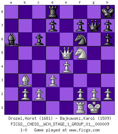 Last move : 1-0 2011 July 25 20:37:45 [Event "FICGS__CHESS__WCH_STAGE_1_GROUP_01__000009"] [Site "FICGS"] [Date "2011.04.15"] [Round "1"] [White "Drozel,Horst"] [Black "Bajkowski,Karol"] [Result "1-0"] [WhiteElo "1681"] [BlackElo "1509"] 1.e4 e5 2.Nf3 Nc6 3.Bb5 a6 4.Ba4 b5 5.Bb3 Nf6 6.O-O Bc5 7.a4 Bb7 8.d3 Qe7 9.axb5 Nd4 10.Nxd4 Bxd4 11.bxa6 Rxa6 12.Rxa6 Bxa6 13.Qf3 c6 14.Nc3 O-O 15.Ne2 Bc5 16.Ng3 Rd8 17.Nf5 Qf8 18.Bh6 gxh6 19.Qg3+ Kh8 20.Qxe5 Be7 21.Nxe7 Qg7 22.Nf5 1-0 Ruy Lopez : Caro variation Kingside Castling by player White (move 6) Kingside Castling by player Black (move 14) Player White won this chess game. Follow this game move after move (download)It's just you and your opponent at the board and you're trying to prove something. (Bobby Fischer) Die Leute spielen gegen mich seit 15 Jahren unter Ihren Möglichkeiten. (Robert James Fischer) Si no le temes a Spassky, entonces elimino el elemento del dinero. (Jim Slater) Que feriez-vous si vous étiez en train de jouer aux échecs et que la fin du monde arrive ? Je continuerais à jouer. (Saint Borromée) History is the quarrels of popes and kings, with wars or pestilences in every page; the men all so good for nothing, and hardly any women at all. (Jane Austen)