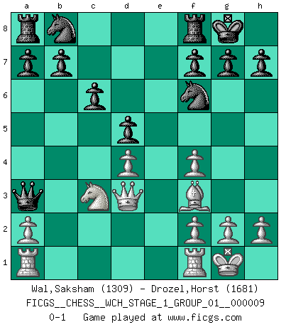 Last move : 0-1 2011 July 11 20:16:37 [Event "FICGS__CHESS__WCH_STAGE_1_GROUP_01__000009"] [Site "FICGS"] [Date "2011.04.01"] [Round "1"] [White "Wal,Saksham"] [Black "Drozel,Horst"] [Result "0-1"] [WhiteElo "1309"] [BlackElo "1681"] 1.d4 d5 2.c4 c6 3.Nc3 Nf6 4.Nf3 e6 5.cxd5 exd5 6.Bf4 Bd6 7.e3 Bxf4 8.exf4 O-O 9.Bd3 Bg4 10.O-O Qb6 11.Be2 Bxf3 12.Bxf3 Qxb2 13.Qd3 Qa3 0-1 This chess game has been lost on time (started : 2011.04.01 9:56:54) QGD Slav defense Kingside Castling by player Black (move 8) Kingside Castling by player White (move 10) Player Black won this chess game. Follow this game move after move (download)There just isn't enough televised Chess. (David Letterman) Der 70jährige Viktor Kortschnoi: Die Rentenanstalt wollte mich zwingen in Rente zu gehen. Meine Frau erhält jetzt eine Pension- und ich zahle weiter in die Rentenkasse ein! (Viktor Kortschnoi) En un gambito tu regalas un Peón por el bién de tomar un juego perdido. (Samuel Standige Boden) Demandez au pauvre Cg1 ce qu'il en pense. Eduard Gufeld à propos de la variante Saemisch de l'Est-Indienne. Every now and then a man's mind is stretched by a new idea and never shrinks back to its former dimensions. (Oliver Wendell Holmes, Sr.)