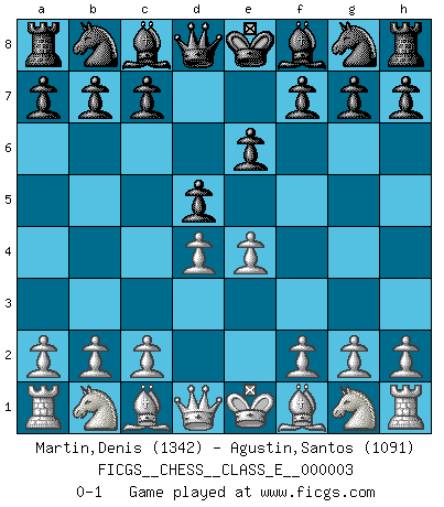 Last move : 0-1 2006 June 20 23:27:59 [Event "FICGS__CHESS__CLASS_E__000003"] [Site "FICGS"] [Date "2006.05.02"] [Round "1"] [White "Martin,Denis"] [Black "Agustin,Santos"] [Result "0-1"] [WhiteElo "1342"] [BlackElo "1091"] 1.e4 e6 2.d4 d5 0-1 This chess game has been lost on time (started : 2006.05.02 13:40:26) French defense Player Black won this chess game. Follow this game move after move (download)The passion for playing Chess is one of the most unaccountable in the world. (H.G. Wells) Bis zum Jahr 1971 verlief in meiner Schachkariere alles glatt. Dieses dramatische Match [Fischer-Taimanov 6:0] machte mein Leben zur Hölle. (Mark Taimanov) Bobby Fischer es el jugador de Ajedrez mas grande que jamás haya existido. (Ken Smith) La conception d'un plan est le processus par lequel un joueur exploite les avantages de sa position tout en s'efforçant d'en réduire au minimum les inconvénients. Afin de garantir le succès, un plan doit toujours se fonder sur un diagnostic objectif des particularités d'une position. La conception d'un plan est d'autant plus difficile que la position est équilibrée, et grandement facilitée lorsqu'il n'existe qu'un seul plan susceptible de répondre aux exigences de la position. (Harry Golombek) The real danger is not that computers will begin to think like men, but that men will begin to think like computers. (Sydney J. Harris)