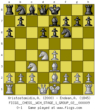 Last move : 0-1 2011 May 12 6:2:2 [Event "FICGS__CHESS__WCH_STAGE_1_GROUP_02__000009"] [Site "FICGS"] [Date "2011.04.01"] [Round "1"] [White "Xristostomidis,Alkis"] [Black "Endean,Andrew"] [Result "0-1"] [WhiteElo "2000"] [BlackElo "1845"] 1.e4 c5 2.Nf3 d6 3.d4 cxd4 4.Nxd4 Nf6 5.Nc3 a6 6.Be2 e6 7.Be3 Be7 0-1 This chess game has been lost on time (started : 2011.04.01 9:59:47) Sicilian : Najdorf, Opovcensky variation Player Black won this chess game. Follow this game move after move (download)The chessboard is the world, the pieces are the phenomena of the Universe, the rules of the game are what we call the laws of Nature and the player on the other side is hidden from us. (Thomas Huxley) Modernes Schach sorgt sich zuviel um Dinge wie Bauernstruktur usw. Vergessen Sie das, Schachmatt beendet das Spiel! (Nigel Short) Prefiero perder una partida realmente buena, que ganar una mala. (David Levy) A ce moment-là, je menaçais de comprendre la position ! (Clément L'Heureux) Happy endings are just stories that haven't finished yet. (Jane Smith in Mr & Mrs Smith)