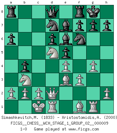 Last move : 1-0 2011 May 16 6:13:34 [Event "FICGS__CHESS__WCH_STAGE_1_GROUP_02__000009"] [Site "FICGS"] [Date "2011.04.01"] [Round "1"] [White "Simashkevitch,Mykola"] [Black "Xristostomidis,Alkis"] [Result "1-0"] [WhiteElo "1833"] [BlackElo "2000"] 1.e4 c5 2.Nf3 d6 3.d4 cxd4 4.Nxd4 Nf6 5.Nc3 a6 6.Be3 e5 7.Nb3 Be6 8.f3 Be7 9.Qd2 O-O 10.O-O-O Nbd7 11.g4 b5 12.Rg1 b4 13.Nd5 1-0 This chess game has been lost on time (started : 2011.04.01 9:59:47) Sicilian : Najdorf, Byrne (English) attack Kingside Castling by player Black (move 9) Queenside Castling by player White (move 10) Player White won this chess game. Follow this game move after move (download)Bobby is the finest Chess player this country ever produced. His memory for the moves, his brilliance in dreaming up combinations, and his fierce determination to win are uncanny. (John Collins) Die westlichen Werte sind eine Sprache, welche die Putin-Administration nicht versteht. (Garry Kasparov) El Ajedrez se juega con la mente... ¡no con las manos!. (Renaud y Kahn) Mais n'est-ce pas déjà le limiter injurieusement que d'appeler les échecs un jeu? N'est-ce pas aussi une science, un art, ou quelque chose qui, comme le cercueil de Mahomet entre ciel et terre, est suspendu entre l'un et l'autre, et qui réunit un nombre incroyable de contraires ? (Stefan Zweig) Methinks King Thibault should dub Marius Zubac a knight of the square board... I mean table, henceforth addressing him as Sir Marius, and bestow on him a suitable land from the kingdom of FICGS & marry him off to a worthy, fair maiden, lest he slice our heads with his mighty sword in his wrath. (Dinesh De Silva)