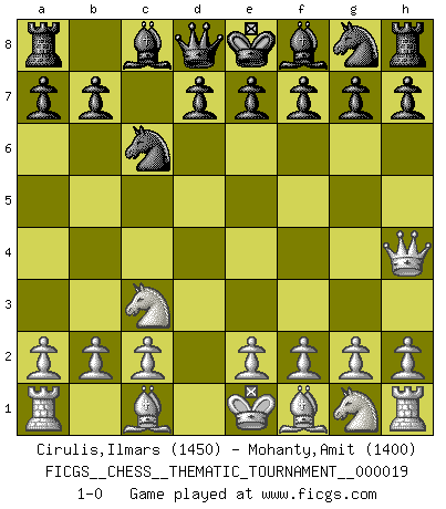 Last move : 1-0 2007 January 24 6:58:58 [Event "FICGS__CHESS__THEMATIC_TOURNAMENT__000019"] [Site "FICGS"] [Date "2006.12.15"] [Round "1"] [White "Cirulis,Ilmars"] [Black "Mohanty,Amit"] [Result "1-0"] [WhiteElo "1450"] [BlackElo "1400"] 1.Nc3 c5 2.d4 cxd4 3.Qxd4 Nc6 4.Qh4 1-0 This chess game has been lost on time (started : 2006.12.15 1:39:58) Novosibirsk Opening Player White won this chess game. Follow this game move after move (download)Why must I lose to this idiot ? (Aron Nimzovich) Mutter, ich bin eben Ex-Weltmeister geworden. --beim nach Hause Kommen nach dem Verlust des WM-Titels an Mihail Botvinnik -- (Mikhail Nekhemyevich Tal) El Ajedrez es parte de la cultura, y si una cultura esta en decadencia, entonces también el Ajedrez declinará. (Mikhail Botvinnik) Je ne crois pas en la psychologie, je crois aux bons coups. (Robert Fischer) No, I am still playing. (Anatoly Karpov)