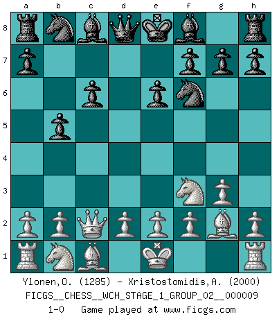 Last move : 1-0 2011 May 12 18:1:32 [Event "FICGS__CHESS__WCH_STAGE_1_GROUP_02__000009"] [Site "FICGS"] [Date "2011.04.01"] [Round "1"] [White "Ylonen,Olli"] [Black "Xristostomidis,Alkis"] [Result "1-0"] [WhiteElo "1285"] [BlackElo "2000"] 1.Nf3 Nf6 2.c4 e6 3.g3 d5 4.Bg2 dxc4 5.Qa4+ c6 6.Qxc4 b5 7.Qc2 1-0 This chess game has been lost on time (started : 2011.04.01 9:59:47) Reti Opening Player White won this chess game. Follow this game move after move (download)With or without the title, Bobby Fischer was unquestionably the greatest player of his time. (Burt Hochberg) Offener Brief an US-Präsident Bush anlässlich der Verhaftung Bobby Fishers: Verhaften Sie mich. Stecken Sie mich in dieselbe Zelle wie Bobby Fisher und geben Sie uns ein Schachspiel mit. (Boris Vassilievich Spassky) Mis oponentes también hacen buenas movidas. A veces yo no tomo esas cosas en consideración. (Bobby Fischer) Pour se monter efficace, un Cavalier a besoin d'avant-postes ! Les Cavaliers font les meilleurs bloqueurs de pions passés. Lamb in skin of tiger, still fears the wolf. (Chinese proverb)