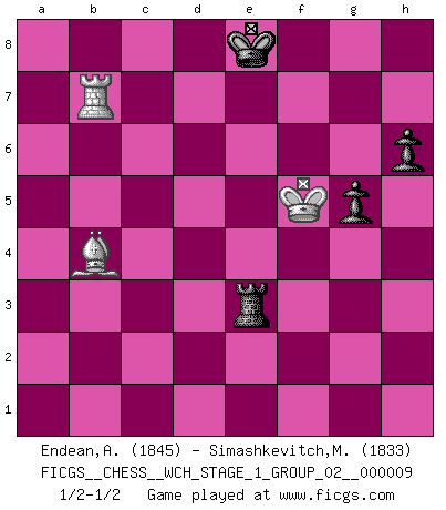 Last move : 1/2-1/2 2011 July 12 21:30:16 [Event "FICGS__CHESS__WCH_STAGE_1_GROUP_02__000009"] [Site "FICGS"] [Date "2011.04.01"] [Round "1"] [White "Endean,Andrew"] [Black "Simashkevitch,Mykola"] [Result "1/2-1/2"] [WhiteElo "1845"] [BlackElo "1833"] 1.d4 d5 2.c4 c6 3.Nf3 Nf6 4.Nc3 e6 5.e3 Nbd7 6.Qc2 Bd6 7.Bd3 O-O 8.O-O dxc4 9.Bxc4 b5 10.Bd3 Bb7 11.a3 a6 12.Ng5 Bxh2+ 13.Kxh2 Ng4+ 14.Kg1 Qxg5 15.f3 Ngf6 16.e4 Qh4 17.Be3 Nh5 18.Ne2 e5 19.Qd2 h6 20.Rad1 Rfd8 21.b4 exd4 22.Bxd4 a5 23.bxa5 Qe7 24.Qc3 c5 25.Be3 Ba6 26.Rd2 b4 27.Qc1 Bxd3 28.Rxd3 Rxa5 29.axb4 cxb4 30.Rfd1 Ra2 31.Rxd7 Rxd7 32.Qc8+ Kh7 33.Rxd7 Qh4 34.Rxf7 Qe1+ 35.Kh2 Qh4+ 36.Qh3 Qxh3+ 37.Kxh3 Rxe2 38.Bd4 Kg8 39.Re7 Kf8 40.Rb7 Nf4+ 41.Kg4 Ne6 42.Bb6 g6 43.Kg3 Ke8 44.Ba5 g5 45.Bxb4 Nf4 46.Kg4 Rxg2+ 47.Kf5 Rg3 48.e5 Rxf3 49.e6 Nxe6 50.Kxe6 Re3+ 51.Kf5 Rb3 52.Ke6 Re3+ 53.Kf5 1/2-1/2 QGD Slav : 4.Nc3 Kingside Castling by player Black (move 7) Kingside Castling by player White (move 8) 10 pieces endgame at move 46 : White KRBPP , Black KRNPP WHITE : King + 1 Rook 1 Bishop 2 Pawns BLACK : King + 1 Rook 1 Knight 2 Pawns 9 pieces endgame at move 48 : White KRBP , Black KRNPP WHITE : King + 1 Rook 1 Bishop 1 Pawn BLACK : King + 1 Rook 1 Knight 2 Pawns 8 pieces endgame at move 49 : White KRB , Black KRNPP WHITE : King + 1 Rook 1 Bishop BLACK : King + 1 Rook 1 Knight 2 Pawns 7 pieces endgame at move 50 : White KRB , Black KRPP WHITE : King + 1 Rook 1 Bishop BLACK : King + 1 Rook 2 Pawns This chess game ended in a draw. Follow this game move after move (download)Chess is a forcing house where the fruits of character can ripen more fully than in life. (Edward Morgan Foster) Besser ein falscher Plan, logisch durchgeführt, als gar kein Plan. (Viktor Kortschnoi) La única cosa que los jugadores de Ajedrez tienen en común, es el Ajedrez. (Lodewijk Prins) La vie et les Echecs sont tous les deux une lutte constante. (Lasker) In my experience, there's no such thing as luck. (Obi-Wan Kenobi in Star Wars ep.4)