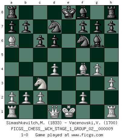 Last move : 1-0 2011 May 17 6:13:50 [Event "FICGS__CHESS__WCH_STAGE_1_GROUP_02__000009"] [Site "FICGS"] [Date "2011.04.01"] [Round "1"] [White "Simashkevitch,Mykola"] [Black "Vacenovski,Vjekoslav"] [Result "1-0"] [WhiteElo "1833"] [BlackElo "1700"] 1.e4 d5 2.exd5 Qxd5 3.Nc3 Qa5 4.d4 Nf6 5.Nf3 Bg4 6.h3 Bh5 7.g4 Bg6 8.Ne5 Nbd7 9.Nc4 Qa6 10.Bf4 c6 11.Nd6+ exd6 12.Bxa6 1-0 This chess game has been lost on time (started : 2011.04.01 9:59:47) Scandinavian defense, Lasker variation Player White won this chess game. Follow this game move after move (download)Chess, like love, is infectious at any age. (Flohr) Sie bekommen vielleicht den Eindruck, dass die Spitzenspieler überhaupt gar nicht so stark sind. Aber das stimmt nicht. Es ist eine Illusion. Mit einem Computer an der Seite ist es sehr leicht, Urteile zu fällen, aber wenn man alleine am Brett sitzt, sieht die Sache ganz anders aus. (Vladimir Kramnik) El Ajedrez es despiadado: debes de estar preparado para matar gente. (Nigel Short) Les échecs sont plus proches de l'art de l'assassinat que de l'art de la guerre. (Arturo Perez-Reverte) I fear not the man who has practiced 10,000 kicks once, but I fear the man who has practiced one kick 10,000 times. (Bruce Lee)